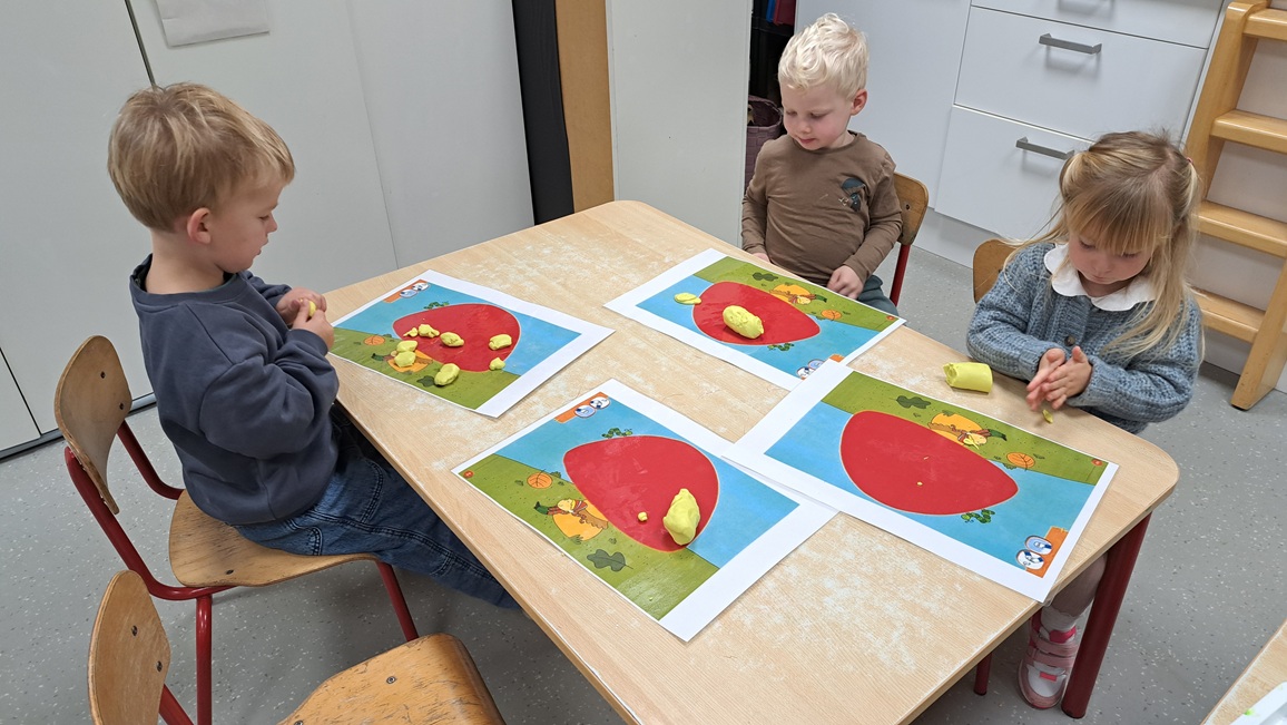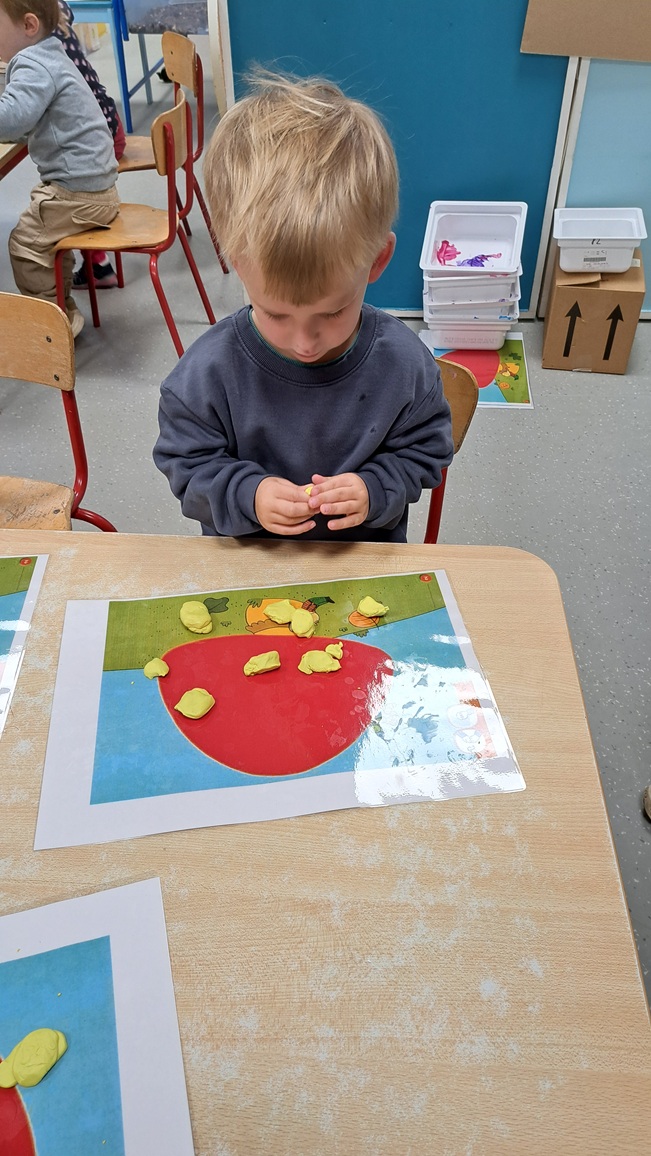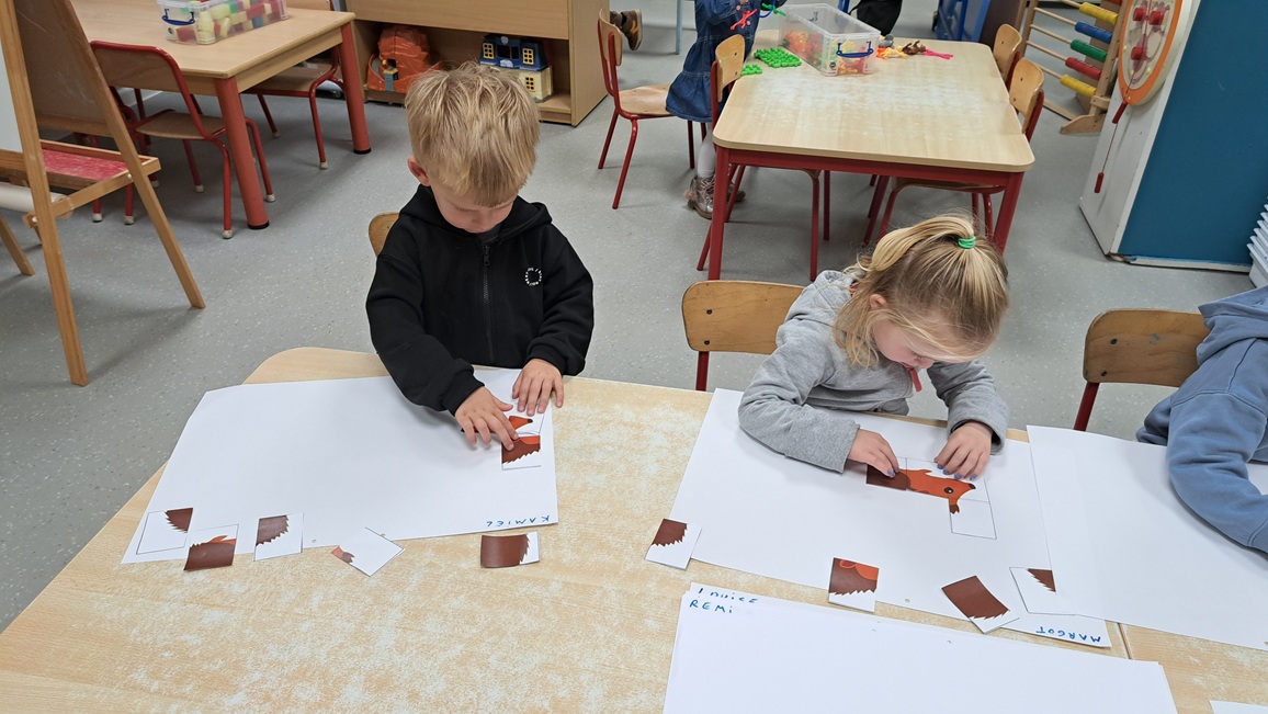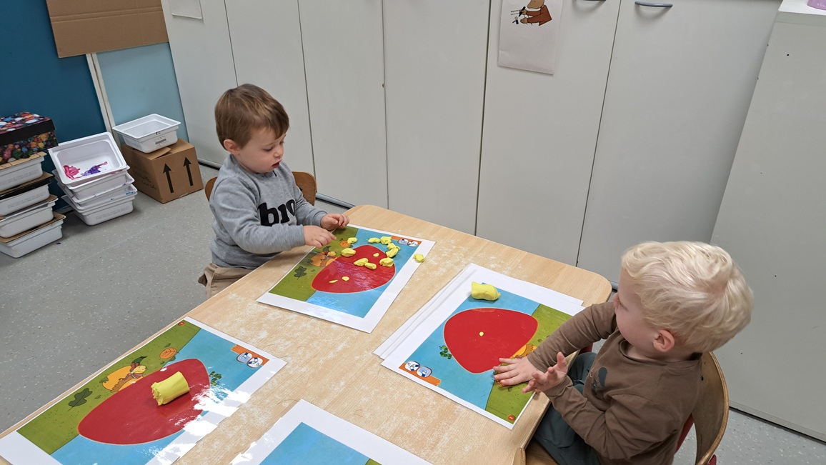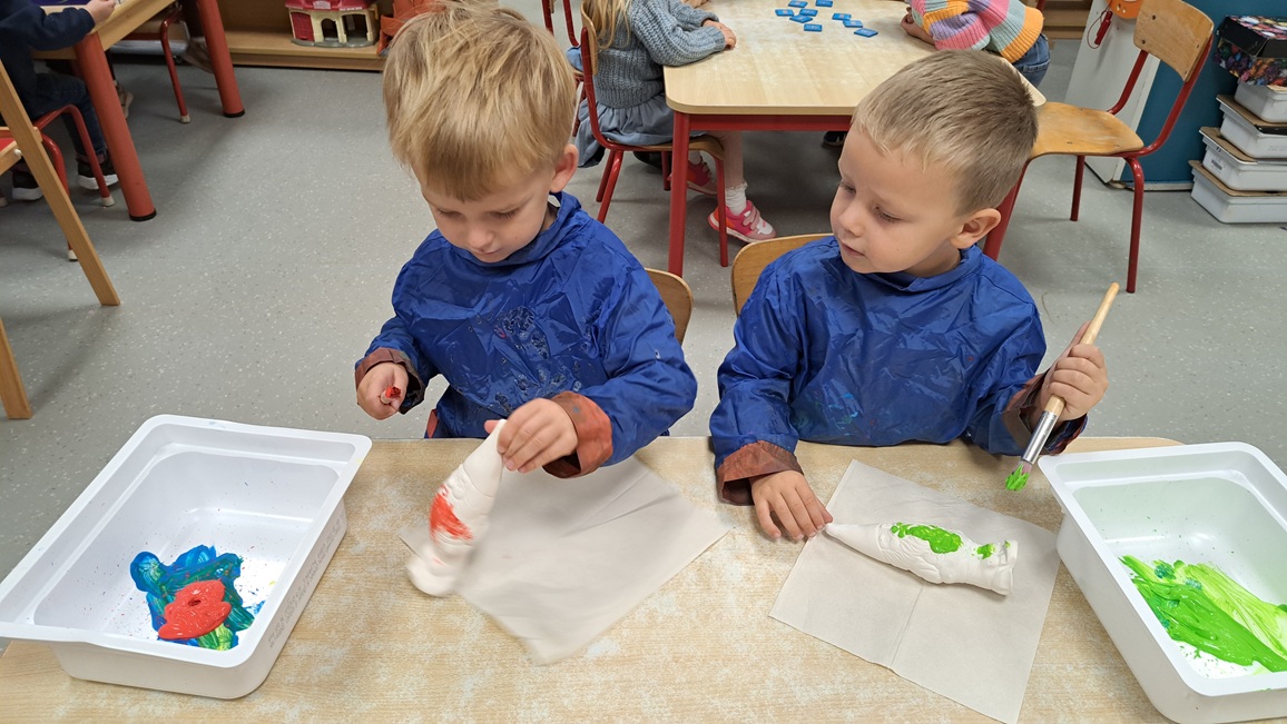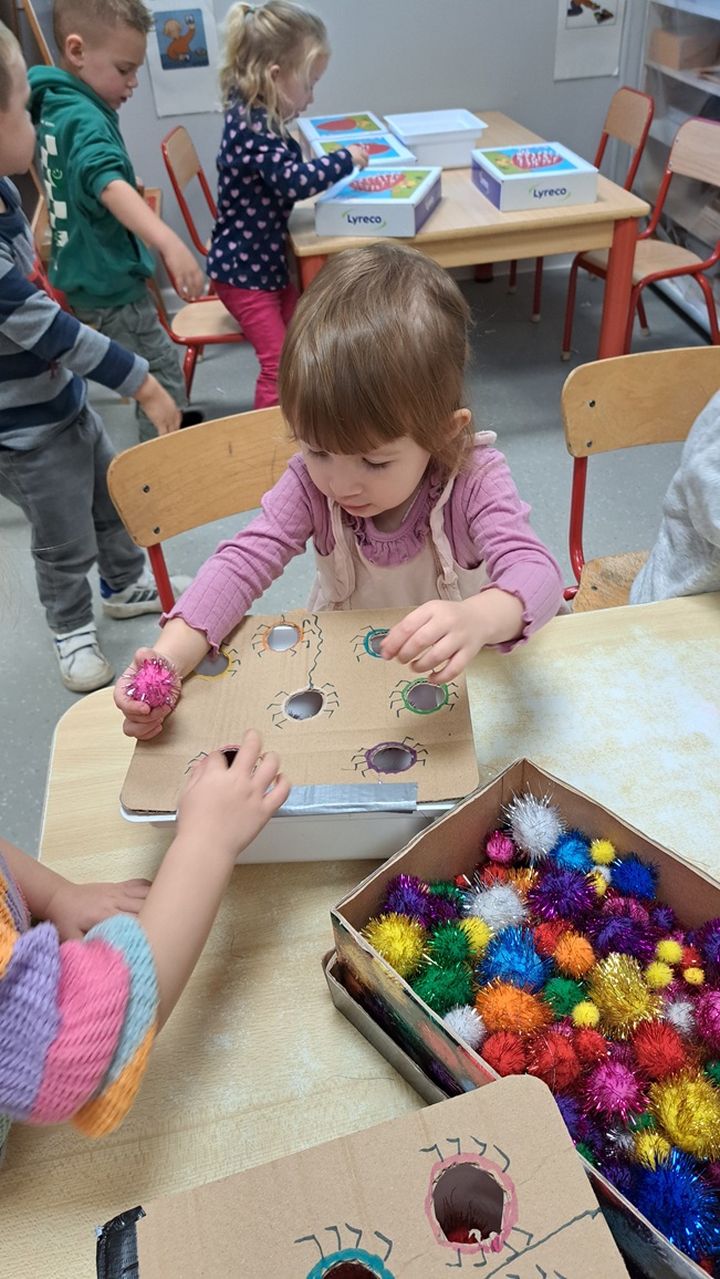 Uit dozen maken we de holletjes van de personages uit het boek na.  Met stempels bestempelen we de holletjes.