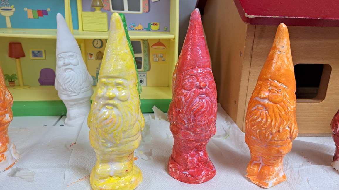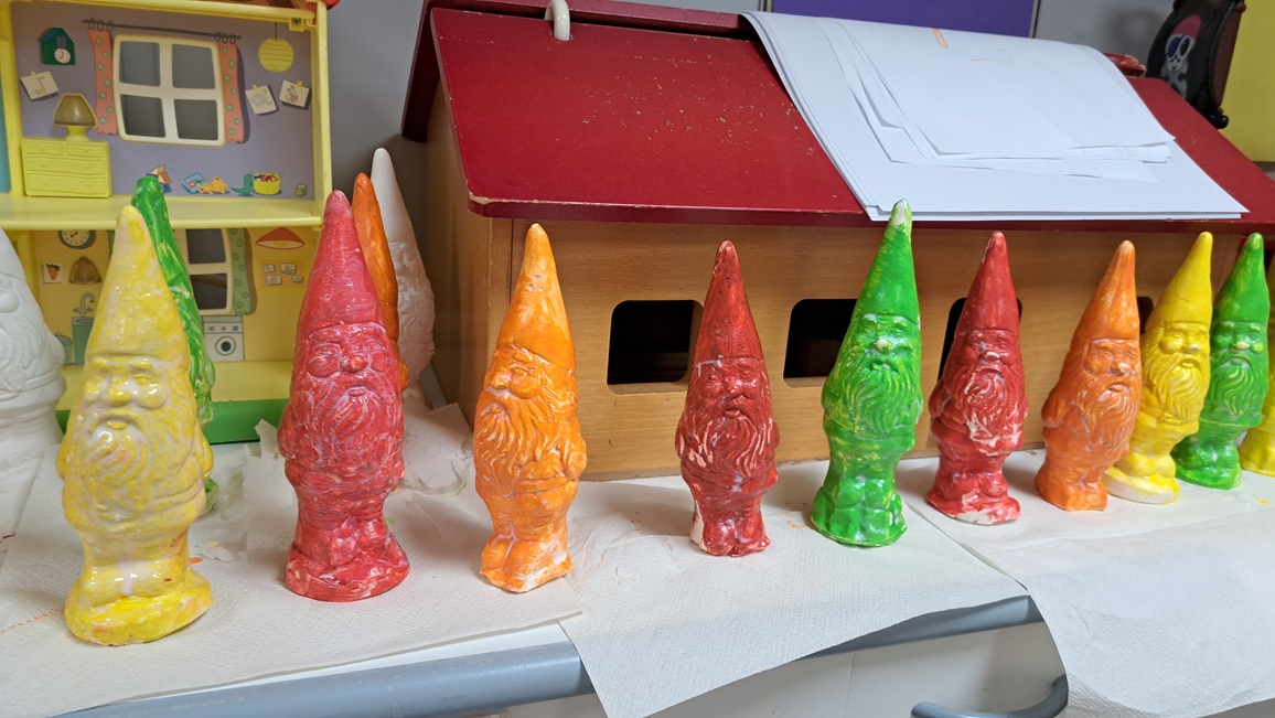 Uit dozen maken we de holletjes van de personages uit het boek na.  Met stempels bestempelen we de holletjes.
