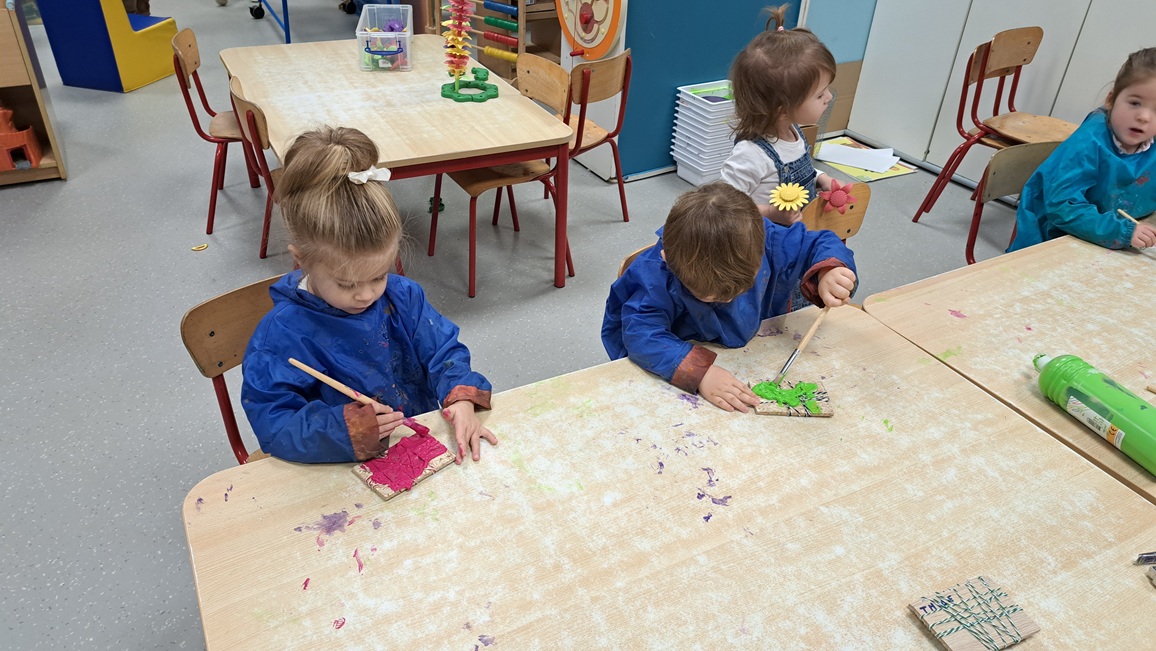 Uit gips maken we eendjes.  Deze eendjes beschilderen we en versieren we met bloemetjes.  Een stukje karton bestempelen we met blauwe en witte verf.  Hierop komt het versje en het eendje = geschenk grootouders.
