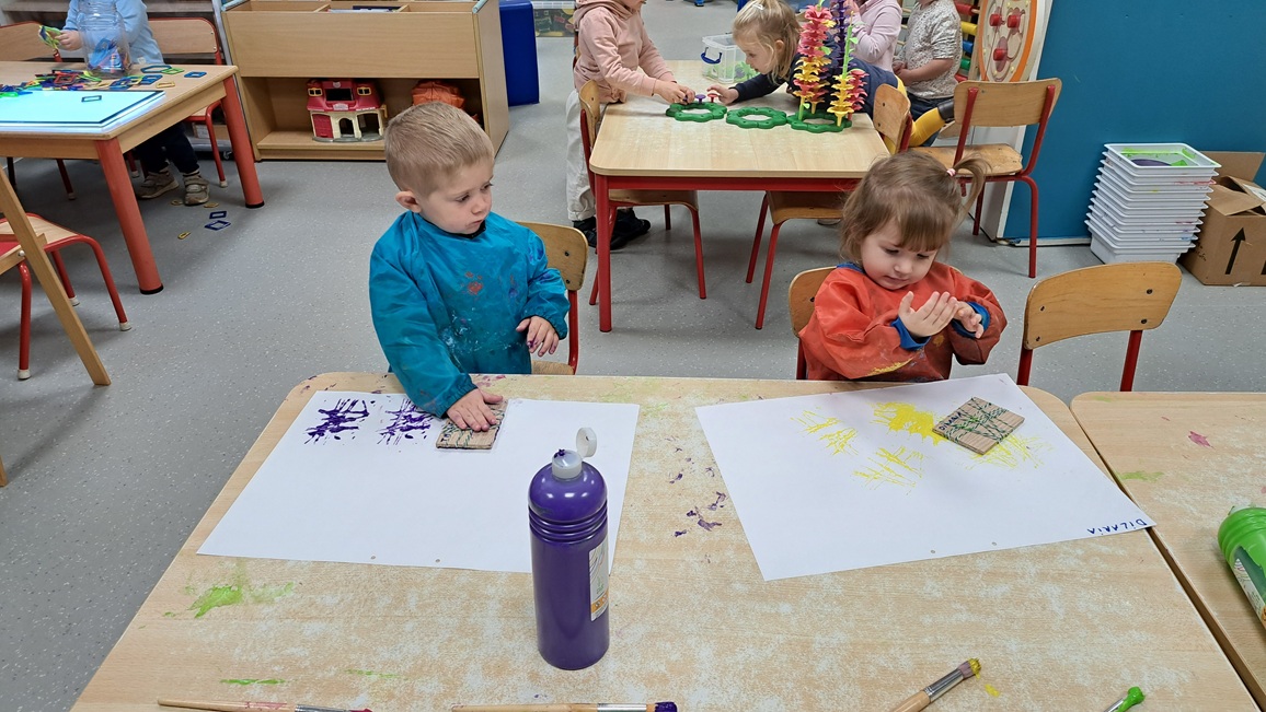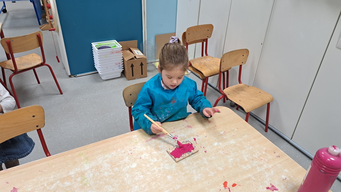 Uit gips maken we eendjes.  Deze eendjes beschilderen we en versieren we met bloemetjes.  Een stukje karton bestempelen we met blauwe en witte verf.  Hierop komt het versje en het eendje = geschenk grootouders.