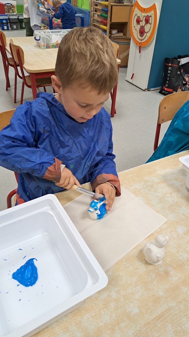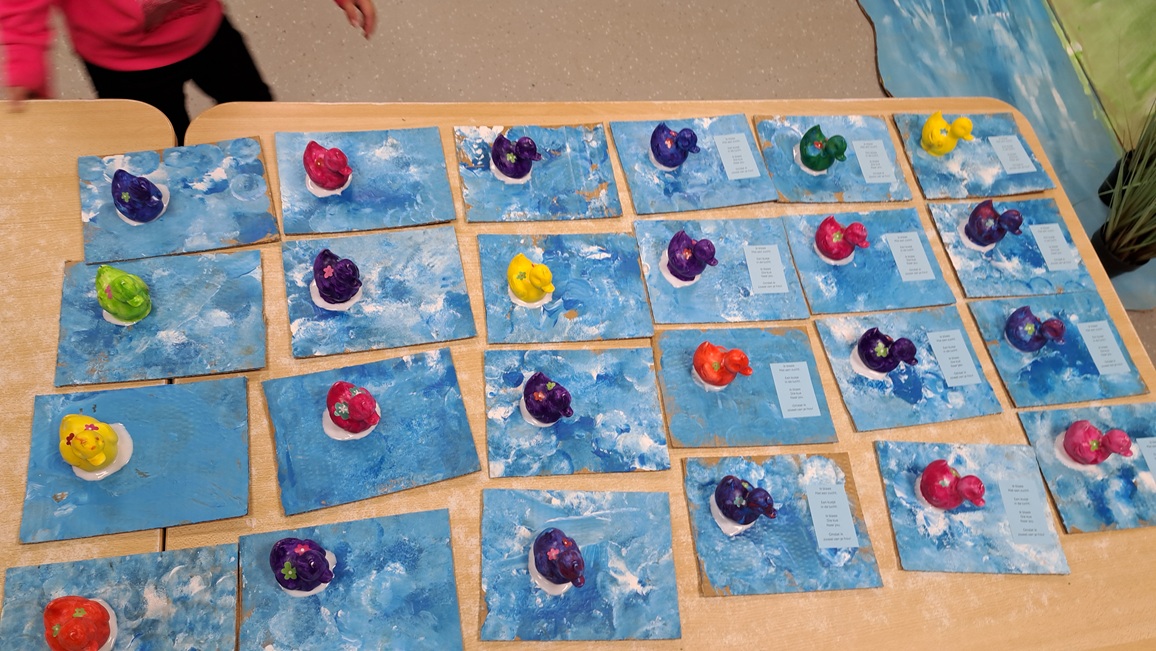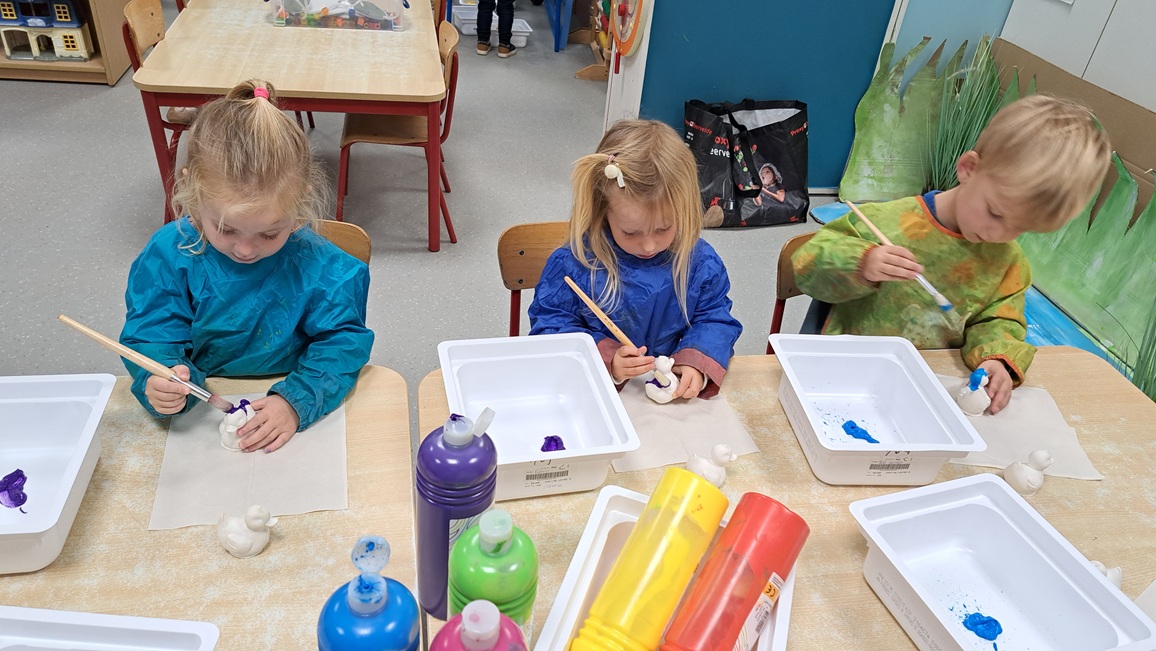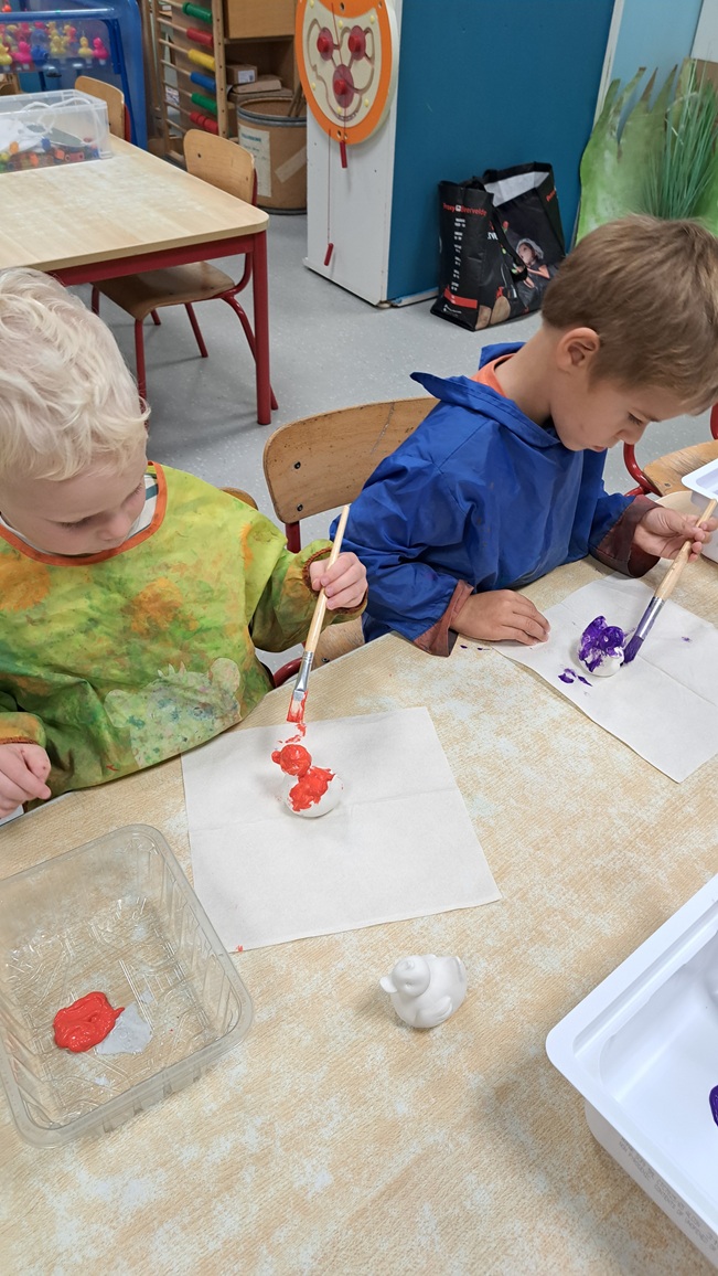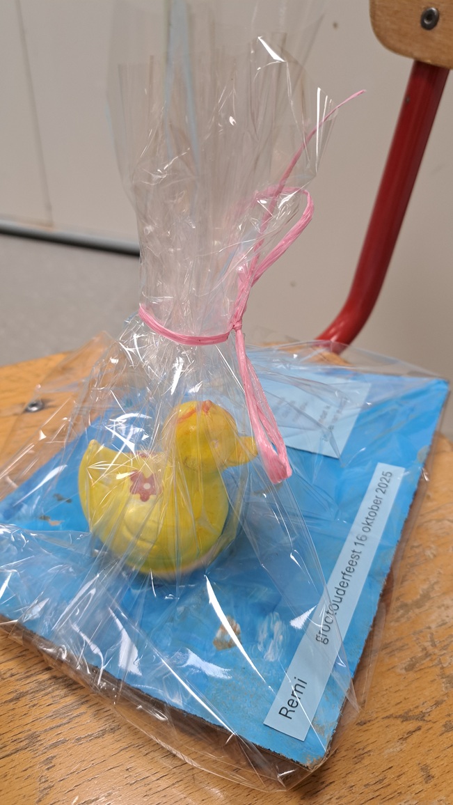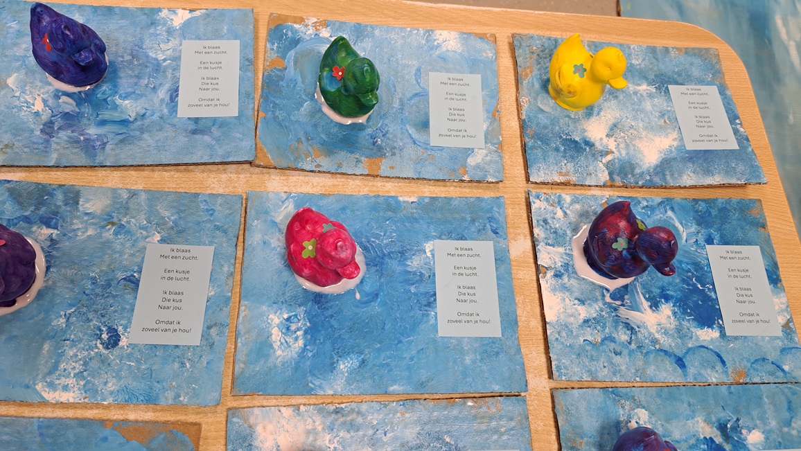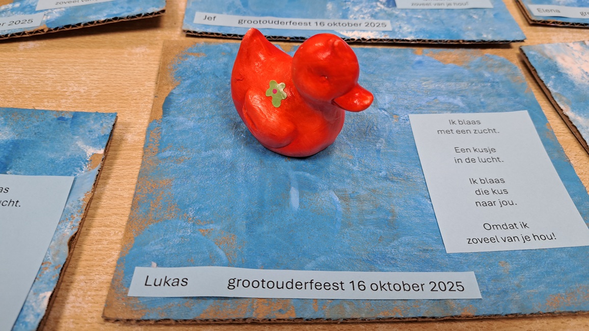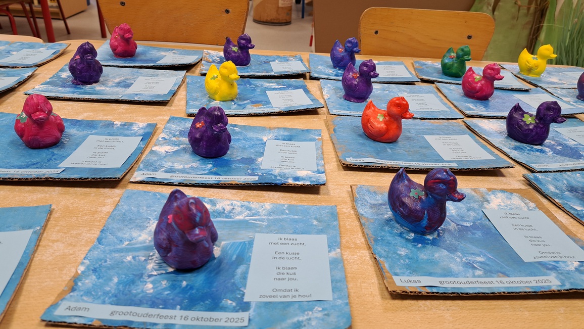 Uit gips maken we eendjes. Deze eendjes beschilderen we en versieren we met bloemetjes. Een stukje karton bestempelen we met blauwe en witte verf. Hierop komt het versje en het eendje = geschenk grootouders.