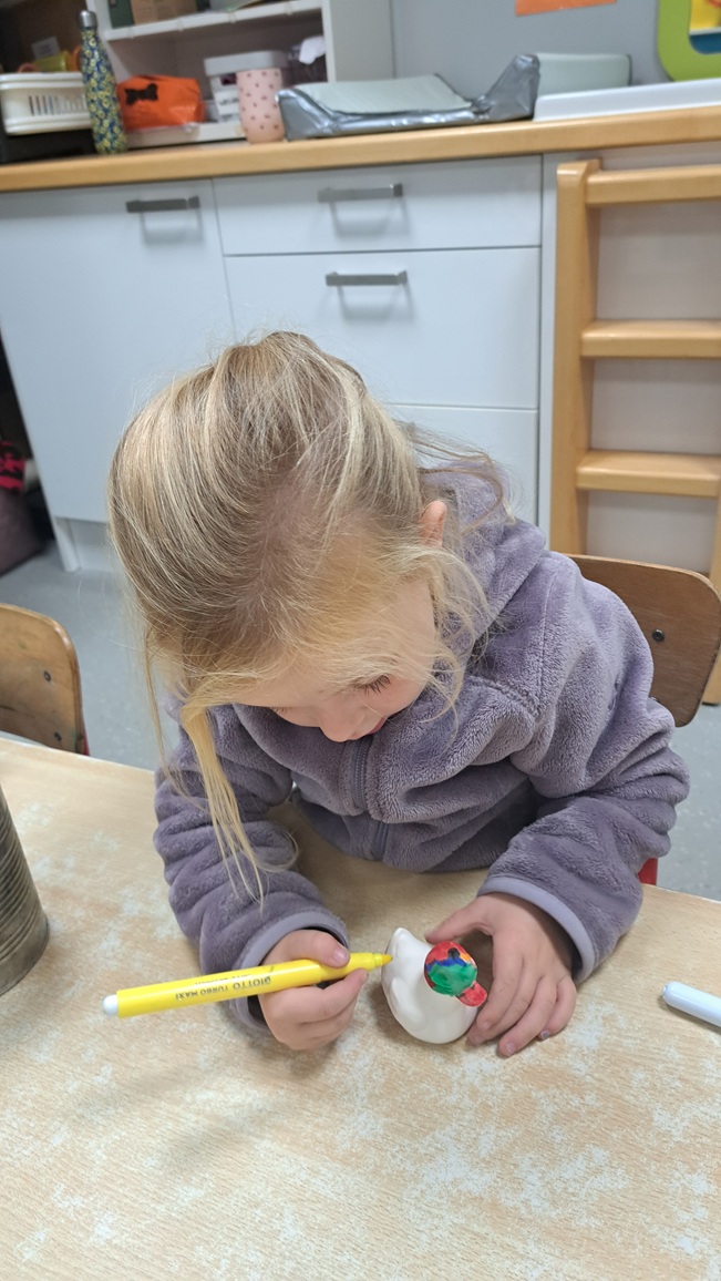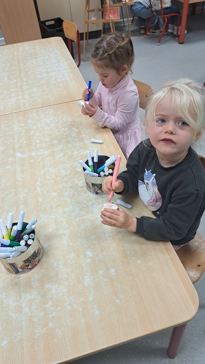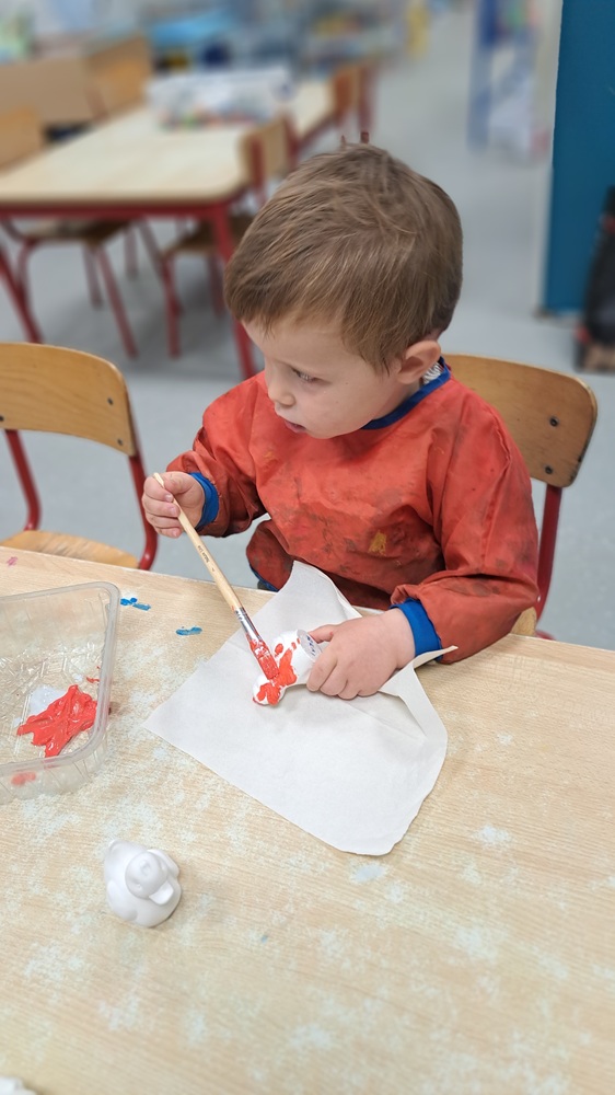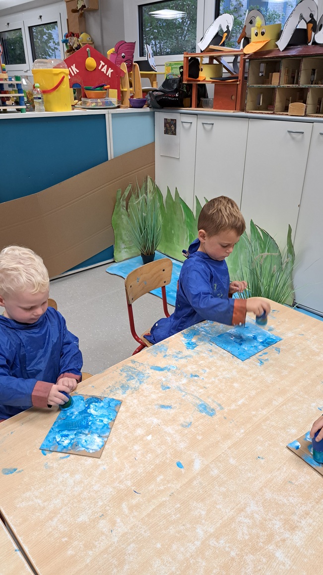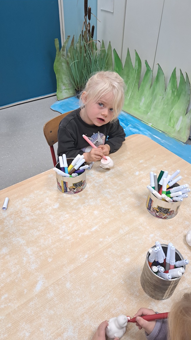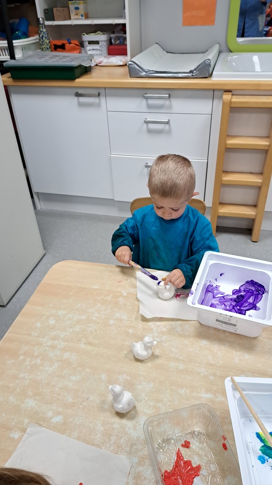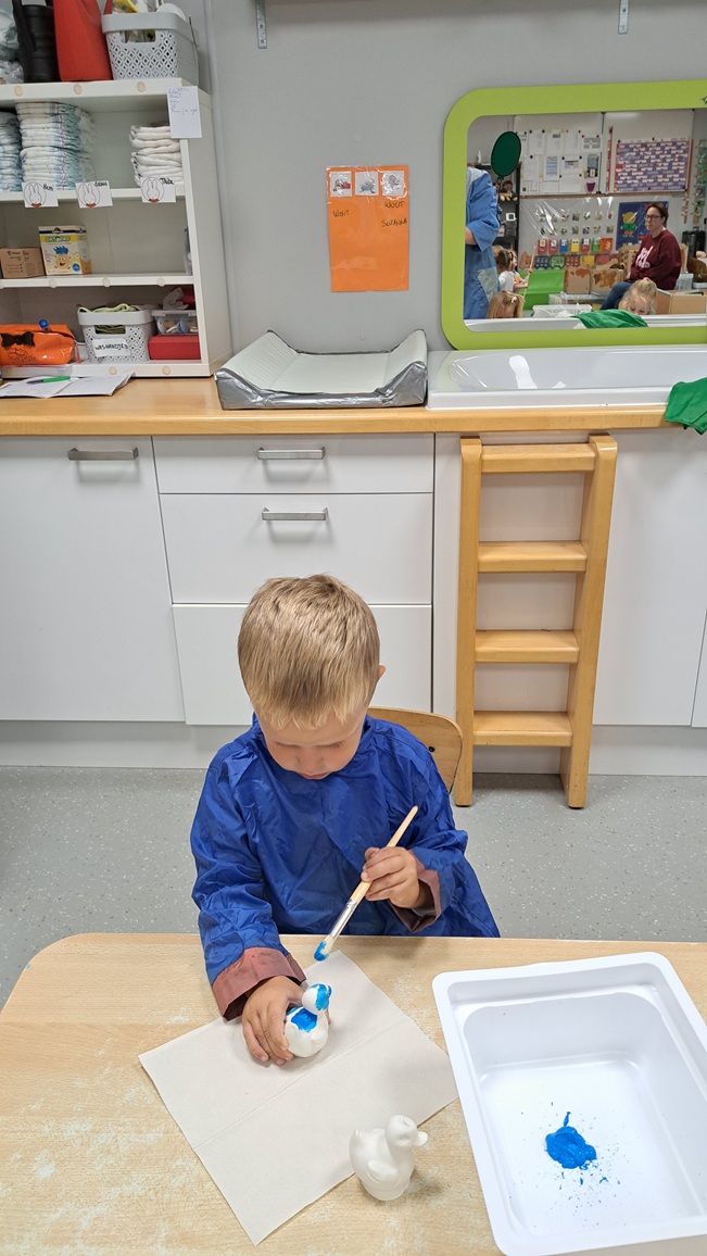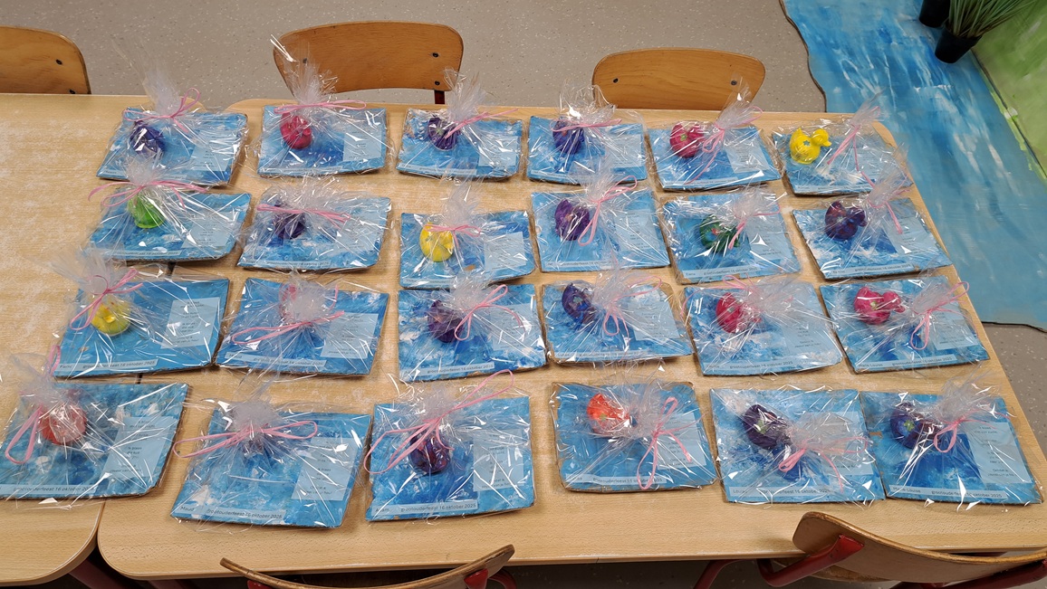 Uit gips maken we eendjes. Deze eendjes beschilderen we en versieren we met bloemetjes. Een stukje karton bestempelen we met blauwe en witte verf. Hierop komt het versje en het eendje = geschenk grootouders.