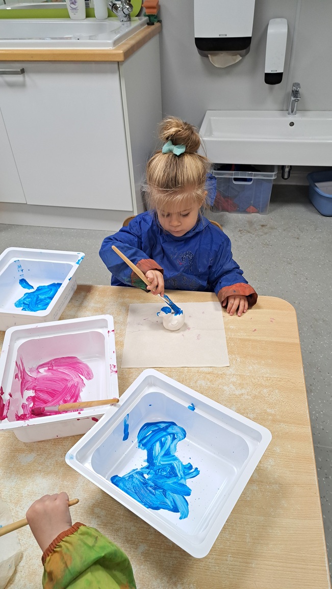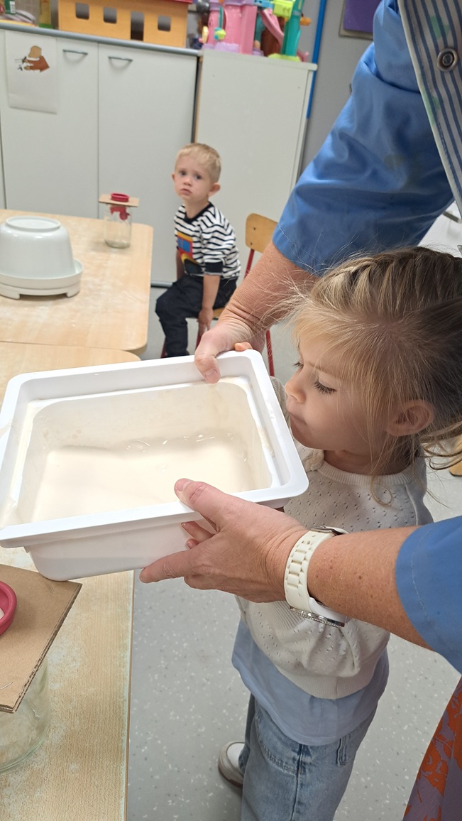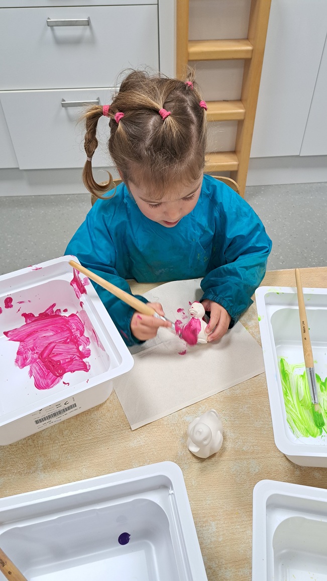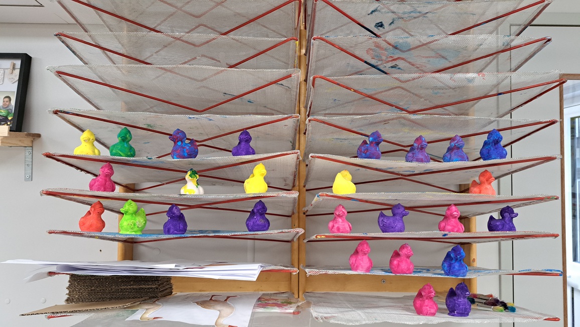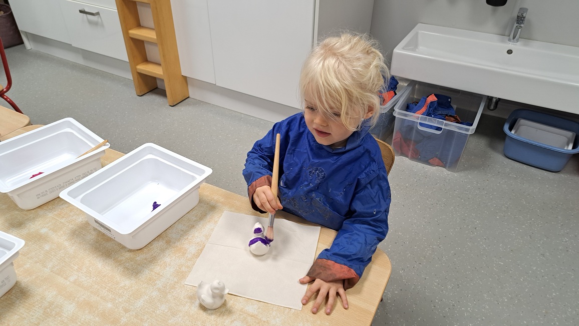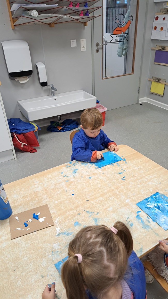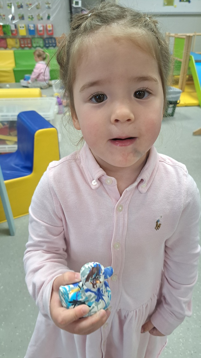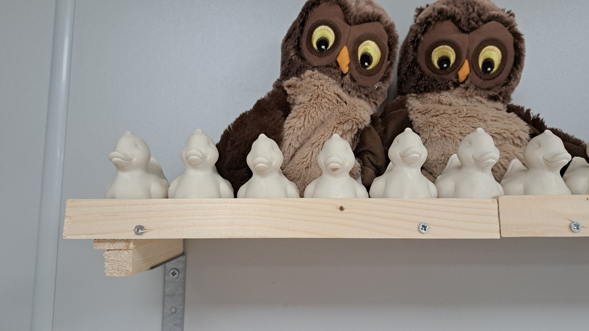 Uit gips maken we eendjes. Deze eendjes beschilderen we en versieren we met bloemetjes. Een stukje karton bestempelen we met blauwe en witte verf. Hierop komt het versje en het eendje = geschenk grootouders.