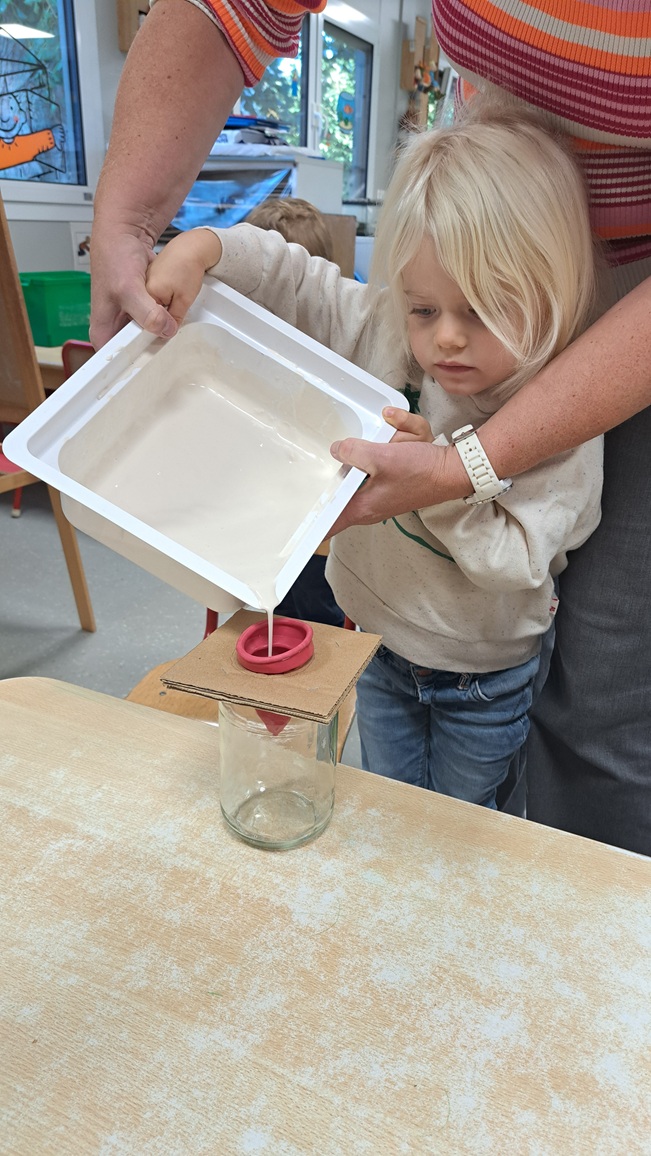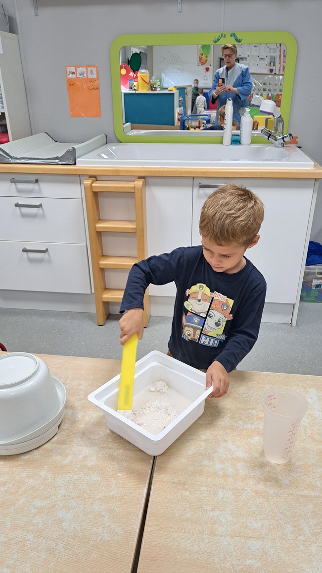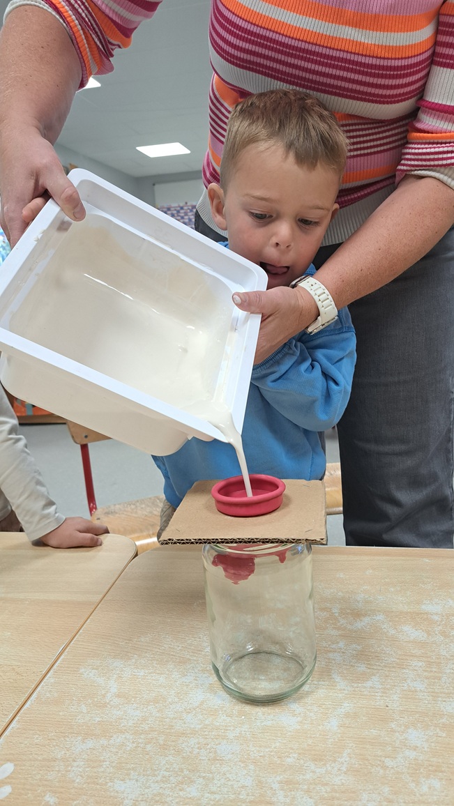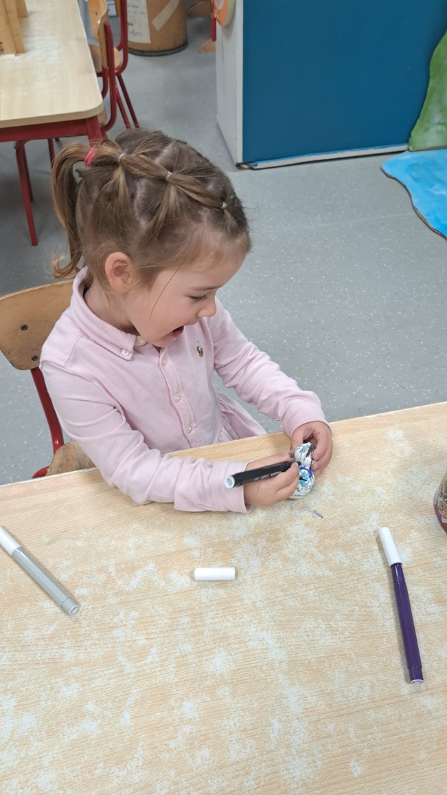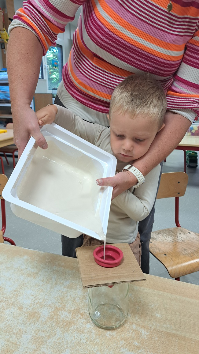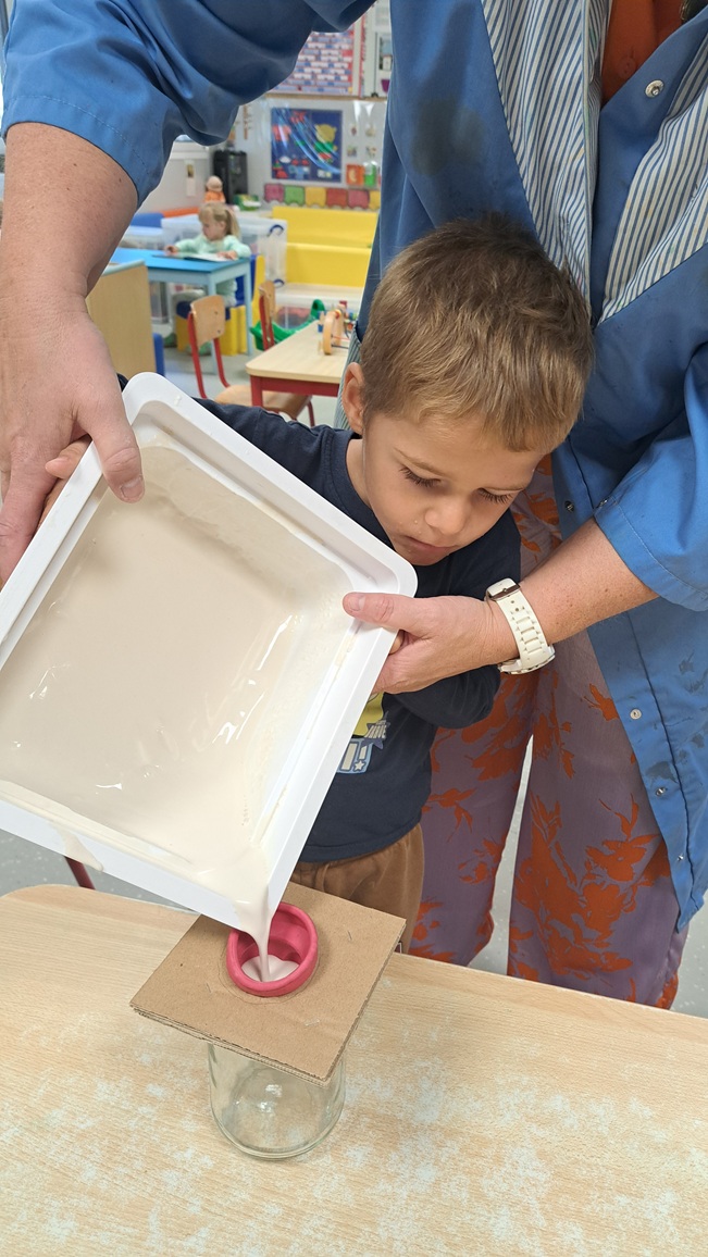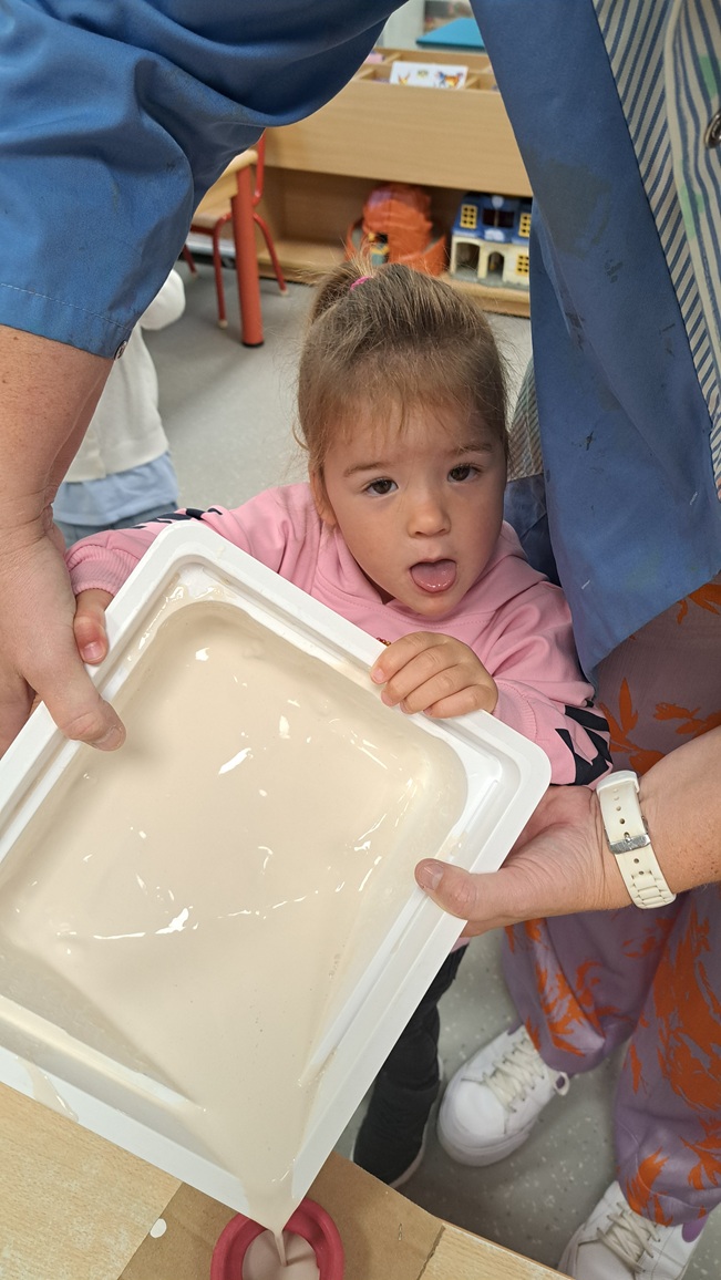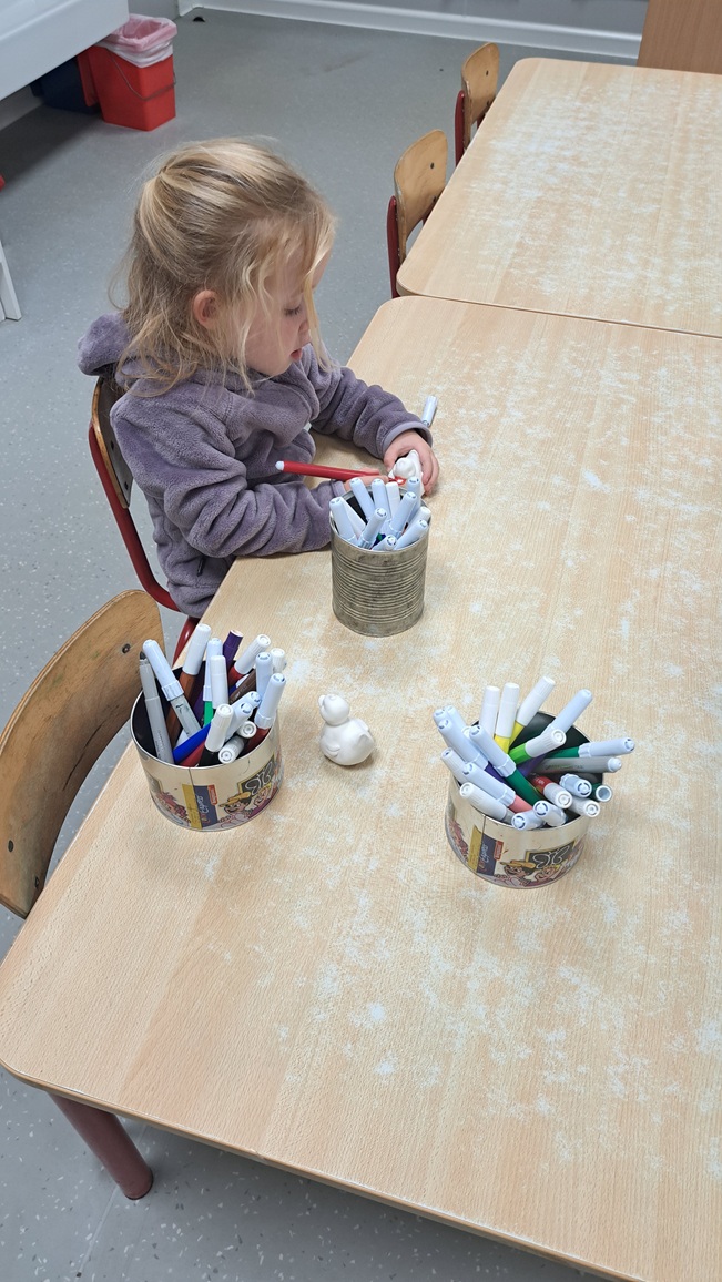 Uit gips maken we eendjes. Deze eendjes beschilderen we en versieren we met bloemetjes. Een stukje karton bestempelen we met blauwe en witte verf. Hierop komt het versje en het eendje = geschenk grootouders.