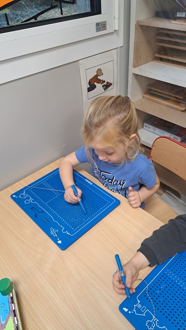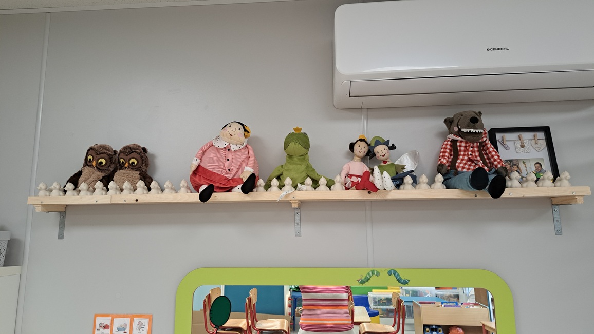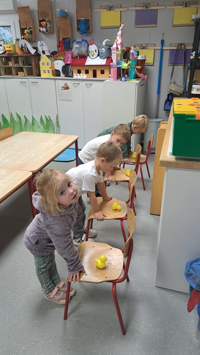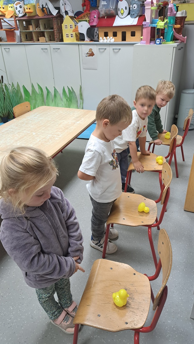 We plaatsen een eend op, onder, voor achter, tussen de stoel(en).