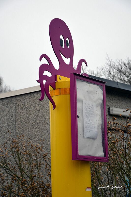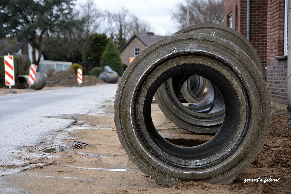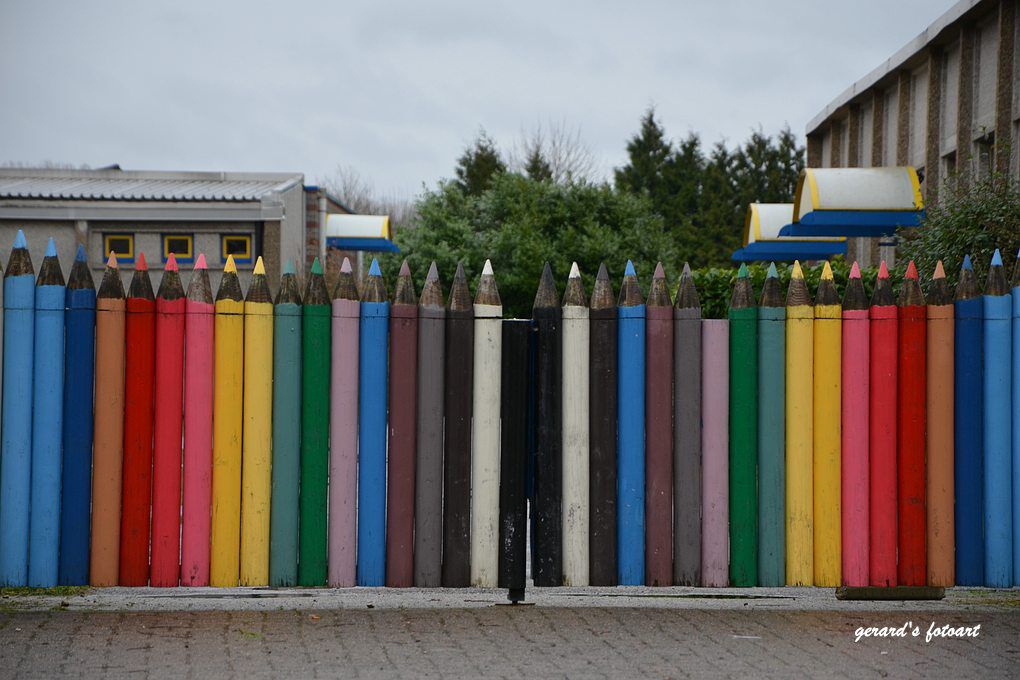 Voor zaterdag heb ik gekozen om in onze straat de werken in beeld te brengen, de afvoer buizen zijn reeds aangeleverd om ze over enkele dagen in de grond te doen verzeilen, wat dan voor onze buurt en vooral straat helemaal open gaat liggen, met alle gevolgen van dien. Iedereen die als eens werken in zijn/haar straat hebben gehad, weten wat het is en zeker wij slecht weer. Voor mijn tweede foto heb ik de keuze gemaakt voor de schoolingang die heel mooi met grote kleurpotloden de poort versiert.