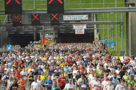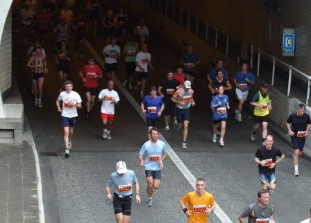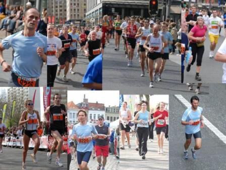 Als nummer 1700 kwam ik over de finish. Op de wedstrijdklok stond 1u19'29. Mijn chip-tijd: 1u13'32''. Aan de start stond zeker 75% van het deelnemersveld voor ons. Er waren 12.500 aankomsten. Ik schat dus dat er een slordige 10.000 lopers voor ons opgesteld stonden. Voor de start werd er door de speaker omgeroepen dat het enkel voor de wedstrijdlopers, die vooraan opgesteld stonden, een wedstrijd was. Alle andere, de 'recreatielopers', moesten het opvatten als een soort van gezamelijke jogging. Ik vraag me dan af waarom iedereen een chip moet krijgen voor een zo correct mogelijke tijdsregistratie? Waarom worden er 'formule 1-startlichten' geplaatst, zodat achteraan ook iedereen duidelijk het moment van de start kan waarnemen en snel mogelijk kan starten? Als ik een chip aan mijn veters krijg en een borstnummer krijg opgespeld, dan wil ik er ook voor gaan... en niet even gezellig samen joggen. Dat doe ik wel op een ander moment. (Waarmee ik niet wil aangeven dat ik de lopers die wél met die intentie aan de start komen, niet apprecieer.) Een goede 6 minuten na het startschot passeerde ik de startlijn. Van andere lopers voorbijsteken, was geen sprake. Er waren immers geen gaten om in te duiken. Tot twee keer toe stond de volledige massa terug stil. Ik dacht dat het woord accordeon-file enkel voor autoverkeer gold, maar na vandaag weet ik dat je het als voetganger/ loper ook kan tegenkomen. En geloof me vrij, de frustratie is zeker zo groot dan wanneer je dergelijke file in de wagen meemaakt. Meerdere keren nam ik me voor dat dit de laatste keer was dat ik hier zou deelnemen. Ik zag nergens het bord van de eerste km, maar ik denk dat er daar wel al een minuut of 7-8 gepasseerd waren. In de tweede km ontstond er een alternatief cross-country parcours over het gras en achter de ruggen van de toeschouwers. Daar was even wat ruimte om voorbij te steken. Op het eerste klimmetje naar de Kennedytunnel stonden er al een aantal 'geparkeerd'. Dit waren weer extra obstakels. Links ontstond er immers een smal en vrij strookje, waar je weer wat kon inhalen, maar de mensen die even moesten stappen, begaven zich naar ditzelfde gootje. Af en toe volop in de remmen dus. Het was eigenlijk pas na de tunnel onder het gerechtsgebouw dat er wat meer ruimte ontstond om in te halen. Kilometeraanduidingen zag ik nergens staan, dus kon ik me niet echt een beeld vormen van waar ik mee bezig was. Maar de hoop op een goede tijd had ik ook al lang laten varen. Het gevoel dat ik nu meemaakte, was vergelijkbaar met één of ander race-spelletje op de computer. Zo een spelletje waar je met een racewagen voortdurend naar links en naar rechts moet laveren om de tragere bolides in te halen. En eigenlijk deed/ doe ik wel graag dergelijke spelletjes. Dus nu vond ik ook terug wat plezier in het lopen. Het gevoel was ook goed. Op mijn hartslagmeter zag ik regelmatig waarden van boven de 170, maar ik kon dat zonder problemen volhouden. De ademhaling bleef vrij rustig. Bij één van de deelnemers die ik voorbijstak, keek ik nog eens om. En ja, het was inderdaad Jan Leyers. Langs de kaaien kon ik mijn inhaalrace verderzetten. Enkele wegvernauwingen zorgden wel opnieuw voor wat constipatie. Het was pas na de doorkomst aan de Grote Markt dat er haast geen moeilijkheden meer waren bij het inhalen van tragere collega's. Bij het passeren van het bord '11', stond er 53 minuten op mijn chrono. Om 1u10' te halen, had ik hier moeten doorkomen in 47'40''. Een goede 5 minuten achterstand op mijn voorziene schema dus. De Waaslandtunnel vormde de laatste hindernis. Ook deze kwam ik probleemloos door. Hier lagen er weer - bijna letterlijk - enkele lijken langs de kant. In de laatste rechte lijn kon ik mijn strak tempo nog een beetje opdrijven. Ik klokte dus af na een goede 1u13'. Ik schat dat ik zo'n 8.000 deelnemers heb voorbijgestoken. Als de afstandsmarkeringen een beetje klopten, zou ik de laatste 5km in ongeveer 20 minuten gelopen hebben. Als dat inderdaad zo is, kan ik toch wel tevreden zijn over deze loopdag. Later meer - met wat foto's.