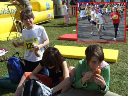Vanmiddag vond er een familie-jogging plaats in Oostrozebeke, op 100m van onze deur. Het was pas deze voormiddag dat ik ervan hoorde. Het kaderde in de Sinksenfeesten. Ik las op een aankondiging in de sporthal dat het ging om een jogging tussen 16u en 17u, waarbij een plaatselijk rondje van 700m verkeersvrij werd gemaakt. De lopers konden dan zelf bepalen hoeveel rondjes ze zouden afleggen. Enerzijds had ik wel zin om mee te lopen. Voor die ene keer dat er eens iets georganiseerd wordt zo dichtbij. Anderzijds had ik het voorgevoel dat er niet veel volk op af ging komen. En dan nog eens dat warme weer. Namiddag gingen we dan op een terrasje iets drinken en dan zag ik toch plots enkele mensen met een sportzak opduiken. Het was dan al 15u45 en ik zat nog met een Hoegaarden voor mij. Ik heb dan vlug mijn glas leeggedronken en toch bij de inschrijving gaan kijken of en hoeveel inschrijvingen er waren. Het bleken er 13 te zijn. Ik heb er dan 14 van gemaakt en ben snel naar huis gegaan om mijn loopkleren aan te trekken. Het was al enkele minuten over 16u toen ik terug aan de sporthal kwam maar daar stonden ze nog steeds te wachten. De warmte nodigde niet uit om eraan te beginnen. Ondertussen kwam ook Dirk Lannoo toegelopen, vermoedelijk de beste Oostrozebeekse loper. Er werd dan toch maar besloten om te vertrekken. Dirk Lannoo liep enkele ronden zo'n 50-tal meter voor mij, samen met wat jeugdig talent. Na enkele ronden trok hij de gashendel open en zag ik hem uit het zicht verdwijnen. Ik bleef mijn zelfde tempo aanhouden - niet te snel en niet te traag. Na ongeveer een half uur dubbelde ik een groepje voor de tweede of derde keer en ik hoorde ze zeggen: "Aan de kant voor de leider". Ik antwoordde: "Ik denk het niet." Ze zeiden dan dat Dirk Lannoo van het parcours was afgedraaid. Zo'n 10 minuten voor het einde zag ik hem terug voor mij. Hij wachtte me even op en zei dan dat hij niet ingeschreven was en daarom tussenin even naar de wagen was gegaan om te drinken en zich dan ook nog was gaan inschrijven. We praatten dan nog wat en liepen samen nog twee ronden. Uiteindelijk liep ik 19 ronden (een goede 13 km) in 57 minuten. Wanneer ik dan in de cafetaria ging kijken naar de tombola-uitslag, bleek dat ik één van de twee hoofdprijzen - een fruitmand - had gewonnen. Ik kreeg dan ook nog een aantal drankjes mee. En dat allemaal voor één euro inschrijving. Het zal de eerste keer geweest zijn dat ik iets verdiend heb aan het lopen