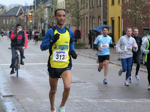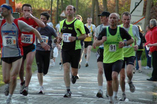 Gisterenavond raakte ik in extremis verzeild in Jabbeke, voor een wedstrijd over 12,1 km. Ik had op de blog van Koen gelezen dat hij daar ging meelopen. Het lag toch min of meer op mijn weg naar huis, dus waarom ook niet deelnemen? (Als je van Antwerpen naar Oostrozebeke moet rijden, ligt half Vlaanderen langs je route...) Het was een wedstrijd van het Houtlandcriterium. Dames en heren vertrokken samen, maar de dames mochten al na 3 rondjes stoppen. De heren moesten er dan nog twee afleggen. Na de enorme drukte van de Antwerp Ten Miles was het leuk om nog eens een 'kleinere' wedstrijd mee te lopen. Enkele honderden meters na de start was het deelnemersveld al redelijk uiteengetrokken en kon je 'vrij' lopen. Ik zat in het begin in een groepje van een 6-tal lopers waar ik af en toe wat beschutting kon zoeken voor de soms toch wel felle wind. In de derde ronde deed ik zelf wat kopwerk in de lastigste zone omdat ik vond dat het groepje stil viel. Een halve ronde later moest ik deze inspanningen bekopen en moest ik het groepje laten gaan. In de 4de ronde kwamen de eerste lopers me dubbelen. Je weet dat het gaat gebeuren, maar toch altijd een beetje pijnlijk. Ik had voor mezelf een tijd van rond de 50 minuten in gedachte en mijn chrono gaf 49'50'' aan bij het overschrijden van de finish. Later bleek het 50'08'' te zijn (14,5 km/u). Een 79ste plaats op 163 deelnemers. De overwinning ging naar Ghirma Woldu (38'03''), voor Dieter Brouckaert en Davy Stieperaere. Achteraf had ik nog een plezante toog-babbel met collega bloggers Koen en Johan. Ervaringen uitgewisseld over lopen, schoenen, bloggen... en intussen nog wat getraind in het drinken van Leffes. Privé-foto's zijn er niet, want mijn persoonlijke fotograaf was niet vrij. Onderstaande foto's komen uit het foto-album van Piet Craeye (AV Jabbeke).