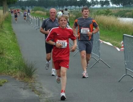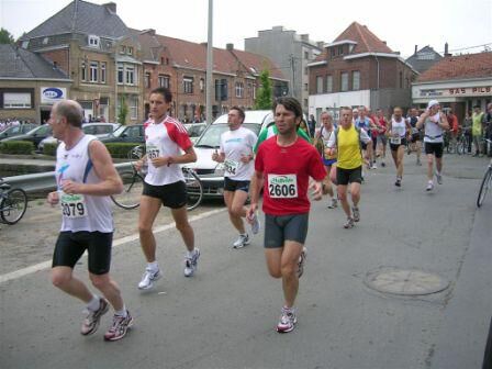 Na de Kids Run werd er om 14u een wedstrijd over 5km gelopen. Ik schat dat er hiervoor een 300-tal lopers aan de start kwamen. De 10 mijl-wedstrijd werd om 15u op gang geschoten. Ik had geen al te grote ambities voor de start. Dit bleek al uit het feit dat ik mijn horloge-hartslagmeter vergeten was. Ook had ik de laatste dagen niet echt op mijn voeding gelet. Gevolg: 2kg extra ballast in vergelijking met enkele weken geleden. Doordat ik in het eerste vak mocht vertrekken, had ik niet veel last van overdreven drukte bij de start. Zonder hartslag-en chronometer was het wel moeilijk om in te schatten hoe ik bezig was in de eerste kilometers. Bij het bordje van 4-km vroeg ik de doorkomsttijd aan een medeloper: 17 minuten exact. Langs de Vaart richting Oostkamp zat de wind soms serieus in het nadeel. Hier belandde ik een groepje van een 5-tal lopers. Af en toe kwam er eenzame loper uit de achtergrond voorbij, maar die liepen nooit ver weg. Het was zwaar om in je eentje tegen de wind op te boksen. Halverwege, na het keren in Oostkamp, viel alles een beetje uit mekaar. Iedereen liep op een 10-tal meter van mekaar. Ik kon de laatste kilometers nog vrij goed mijn tempo houden en kon zo nog enkele deelnemers voorbijsteken. Net voor de aankomst kreeg ik nog een drietal binnen bereik, maar ik had geen fut meer om het laatste beetje energie er nog uit te persen. Bij het overschrijden van de aankomstlijn zag ik 1u09'10'' op de klok staan. Het is een beetje vreemd als je geen enkel idee hebt van je doorkomsttijd (behalve dan bij 4km) en je dan plots je tijd aan de aankomst ziet. Ik was er wel tevreden mee. Het schijnt dat de afstand dit jaar wel de 10 mijl benadert. De 8 minuten die ik sneller ben dan vorig jaar, dienen dus behoorlijk gerelativeerd te worden. Als ik de vergelijking maak met de 10 Mijl van Oostende naar Brugge van begin dit jaar, dan schat ik beide prestaties ongeveer even hoog in. Toen liep ik een 2-tal minuten sneller, geholpen door een stevige rugwind over het hele traject.