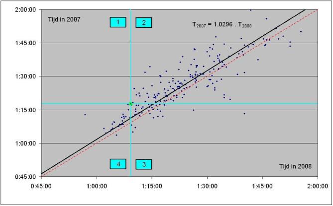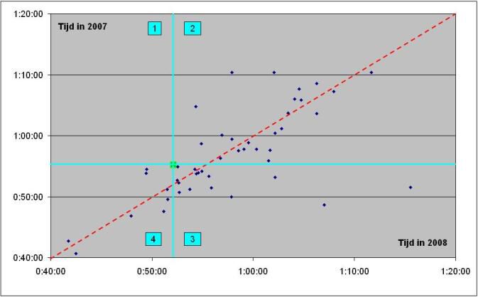 De blauwe bolletjes geven de resultaten weer van de deelnemers die zowel in 2007 als in 2008 deelnamen. De aankomsttijd in 2008 kan worden afgelezen op de horizontale as, die van 2007 op de verticale as. Mijn resultaten worden voorgesteld door het groene vierkantje.