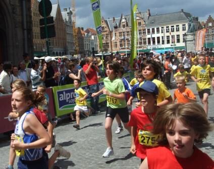 Rond 12u30 kwamen we gisteren aan in Brugge. We hadden besloten om braafjes de goede raad van de organisatie op te volgen en te parkeren aan het Bloso-centrum. Hier werd dan een pendeldienst georganiseerd om de lopers naar de start te brengen. We moesten daar een poosje wachten op de bus en we begonnen al wat ongerust te worden om nog tijdig aan de start te geraken. Clara en Victor zouden deelnemen aan de Kids Run en die ging om 13u30 van start. Rond 12u45 zagen we een busje verschijnen en zo raakten we toch nog goed op tijd aan de inschrijving.