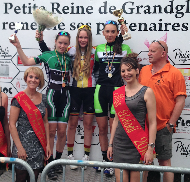 (vooraan) en Jordy (rug) tijdens hun BK tijdrijden en het podium U15 Drongen.