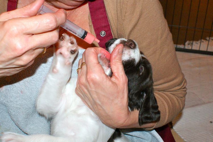 Gisteren was het zondag en werden de welpjes al 4 weken! Wow wat gaat de tijd toch snel! We zijn al in de helft van hun verblijf bij ons! Voor de nieuwe pup-eigenaars is het aftellen begonnen naar het moment dat ze hun hondje mee naar huis kunnen nemen. Maar eerst moet er nog een heel programma afgewerkt worden opdat ze als goed opgevoede puppy's kunnen vertrekken. Op 2, 4 en 6 weken is het nog aan ons om er voor te zorgen dat ze gezond opgroeien vandaar dat het vandaag tijd was om nog eens met de roze spuit ontwormingsmiddel op de proppen te komen. Het proesten was niet meer zo erg als de eerste keer maar nu moest er wel opgelet worden voor de vlijmscherpe nageltjes en tandjes.