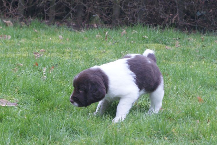 Nu het trainen van de behoefte-op-het-potje-doen beter en beter verloopt, hebben we vanmorgen de beslissing genomen de hondjes een voor een aan de frisse lucht te zetten. Natuuuurlijk niet voor lang want het was tamelijk frisjes en het gras was niet helemaal droog. Het werd een succes over heel de lijn. Alle pups waren in het begin een beetje onwennig, de ene al wat meer dan de andere, maar na wat aanmoediging van Ute liepen ze toch achter haar aan. Ze hebben allemaal wat op een grassprietje of een dor blaadje gezabbeld en zijn dan door de achterste pootjes gegaan om hun plasje te laten te lopen. Er waren er zelfs twee bij die het gazon met hun "kakje" bemest hebben. Het lawaai van een geweerschot mocht natuurlijk niet ontbreken maar ook hier kunnen we zeggen... allemaal schotvast!