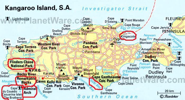 Kangaroo Island, is het op twee na grootste eiland van Australië. Het eiland was onbewoond toen het in 1820 werd ontdekt door Matthew Flinders, een Engelse ontdekkingsreiziger. Inheemse plantengroei bedekt nu nog ongeveer de helft van het eiland. Een derde van het eiland is aangeduid als beschermd natuurgebied. Mede hierdoor is Kangaroo Island de ideale plaats om inheemse dieren in hun natuurlijke leefomgeving te bewonderen.