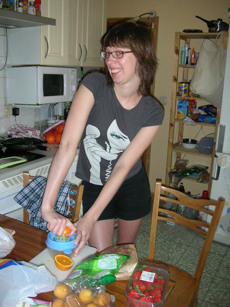 Eva en Thomas hebben ons een heerlijk ontbijt gemaakt! Hier zie je Eva eventjes tonen hoe je een sinaasappel perst, maar natuurlijk heeft Thomas dit werk moeten afwerken! Eva heeft zich nuttig gemaakt door heerlijke eitjes te bakken!!