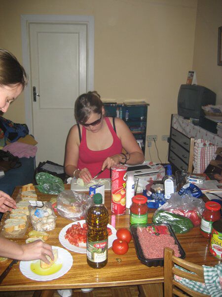 Naar de winkel en koken maar. Liselotte zorgde voor een heerlijk voorgerecht! Terwijl Sarah al druk bezig is met het snijden van ajuin voor de spaghetti-saus, en om de tranen tegen te gaan, zetten we dan een zonnebril op.