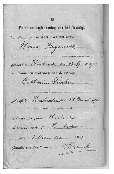 Werner was een vlijtig man,van beroep mijnwerker en hij had een grote passie; fietsen. In z`n jeugdjaren fietste hij dan ook op de baan hij had 11 nakomelingen, waarvan twee op jeugdige leeftijd stierven. De meisjes hadden in deze familie de overhand zij waren met hun zessen. Jongens waren er drie. De leeftijd van de oudste en de jongste lag ver uit elkaar lichtend voorbeeld; toen ik de eerste communnie deed in 1947, trad mijn oudste zus in het huwelijk. Stel je voor; na mij kwamen nog twee meisjes. Mathieu (broer van vader), die later een bakkerswinkel had had 2 kinderen. Hij was gehuwd met Fienke Geurts. Ze waren woonachtig aan de Bleijerheiderstraat. Fienke heeft de respectabele leeftijd van 90 jaar met de hele familie mogen vieren mogen vieren. Het grote feest voor haar was bij Werner Heijenrath een van de zonen van Nonk Juupje in het roemrijke cafe "der Sjlaachboom". Jozef (Nonk Juupje) had 4 kinderen 2 jongens en 2 meisjes. Nonk Juupje was getrouwd met Tant Lieza. Hij was electricien op de mijn. Had een prachtige stem die hij graag aan iedereen en op ieder feestje liet horen. Nicolaas had ook 4 kinderen 1 meisje en 3 jongens. Nonk Niek was getrouwd met tant Lenie ( Poock) zij hebben altijd in Heerlen gewoond Nonk Nicola zoals wij hem altijd noemden was in z`n jongenjaren met zijn broer Mathieu een goede voetballer. De jongens in de familie hebben maar twee stamopvolgers voortgebracht en die twee hebben verder geen stamopvolger, slechts een, mijn zoon (zie WWW/Ron Heijenrath) heeft een dochter en in de regel is dat dus geen stamopvolger. Na mijn zoon, die de jongste is in de stam van de aftakking Werner Heijenrath ( hij draagt wel de naam van mijn vader), sterft de tak Werner Heijenrath dan ook uit. Werner, mijn vader dus, was getrouwd met Catharina (Trienke) Fischer. Bij haar thuis hadden ze 5 kinderen. Drie jongens en twee meisjes: de oudste was Billa, dan Trienke, Jozef, Jacob en Leonard. De ouders van mijn moeder waren Antoon Fischer en Gertruda Thomas. Zij woonden rond 1900 net als mijn vader in Bleijerheide. Jozef en jacob zijn voor hun vijftigste gestorven. de andere drie hebben een normale leeftijd mogen bereiken. Mijn moeder heeft na de dood van haar echtgenoot niet lang meer geleefd. In het dorp bij ons zei men steeds: "die twee zijn twee handen op een buik". Na mijn vaders dood volgde mijn moeder snel. Pa en Ma jullie waren de beste en liefdevolste voor jullie kinderen. Mijn mooiste herinneringen gaan terug naar hun vijftigjarig huwelijk. Samen hebben de kinderen gezorgd dat dat een grote happening werd... waar allen graag aan terug denken.