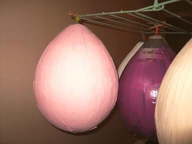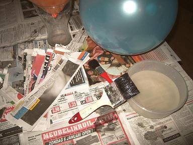 Nodig: Grote ballonnen, behangplaksel, krantenpapier, kwast en een vaas om de ballon op te zetten. Ballonnen opblazen, behangplaksel aanmaken, krant in repen en stukjes scheuren. Plak vervolgens met veel plak het krantenpapier op de ballon. Het papier moet helemaal nat zijn. De ballon moet helemaal bedekt zijn. Het is een glibberig werkje! Omdat het papier vervolgens moet drogen en het natuurlijk overal aan vast plakt, heeft Irmie de ballonnen aan een wasrekje gehangen. Als de ballonnen droog zijn, moet er op dezelfde manier nog een laagje papier op. En daarna nog een derde laagje. Het schijnt het beste te zijn om tussendoor de ballonnen steeds te laten drogen. Irmie begrijpt niet zo goed waarom en is ook niet zo geduldig van aard....