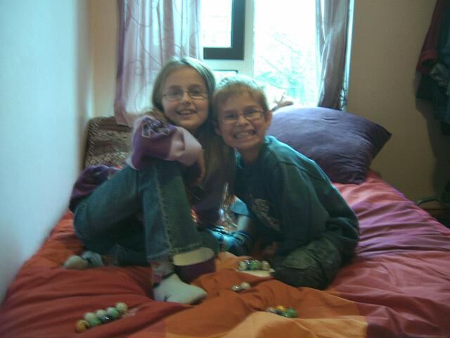 Daarna zijn we op de keurig opgemaakte bedden gaan springen. Die voldeden nog prima. Toen we moe waren hebben we met onze nieuwe knikkers op bed gespeeld. Irmie ging toen roken op het balkon want ze heeft ons beloofd om deze week niet binnen te roken.