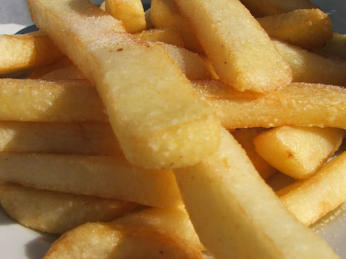 Vanavond heeft Irmie in haar spiksplinternieuwe frietpan friet gebakken. Van die dikke net als op de foto hiernaast. Daarbij kipschnitzel, erwtjes/mais en salade. Speciaal voor pappa en mamma: Vandaag hebben we alleen maar een verrassingsei gesnoept! Verder helemaal niks. Ook geen zakje chips 'savonds. We vergeten het gewoon. Morgen en overmorgen moeten we nog wel alle kiwi's en mandarijnen hier opeten. Daar is Irmie niet zo dol op...