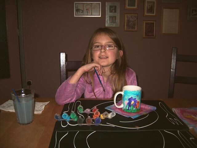 Vanmiddag hebben we allebei een beker beschilderd. De verf moet 24 uur drogen en dan nog een half uur bakken in de oven. Dan gaat de verf er noooooooit meer af. Er bleef nog heel veel van die speciale verf over. Volgend jaar kunnen we dus al Irmies witte serviesgoed opvrolijken. Hihi.
