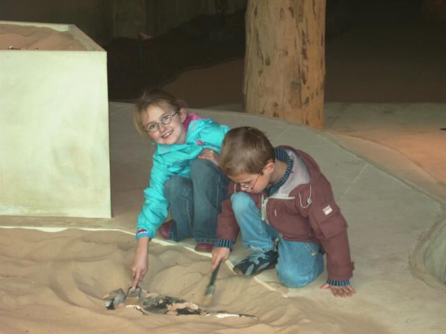 Na het bekijken van de dinosaurussen konden we in een grote zandvlakte ook skeletten opgraven en met een kwast elk botje blootleggen. Fenna heeft toen alle opgravingen ook nog netjes getekend en opgeschreven. Ze leek wel een echte archeologe. We zijn ook nog gaan kijken in andere zalen van het museum. Heel prachtig maar we zijn niet lang gebleven omdat je er niet mocht praten. Ook niet heel zachtjes...