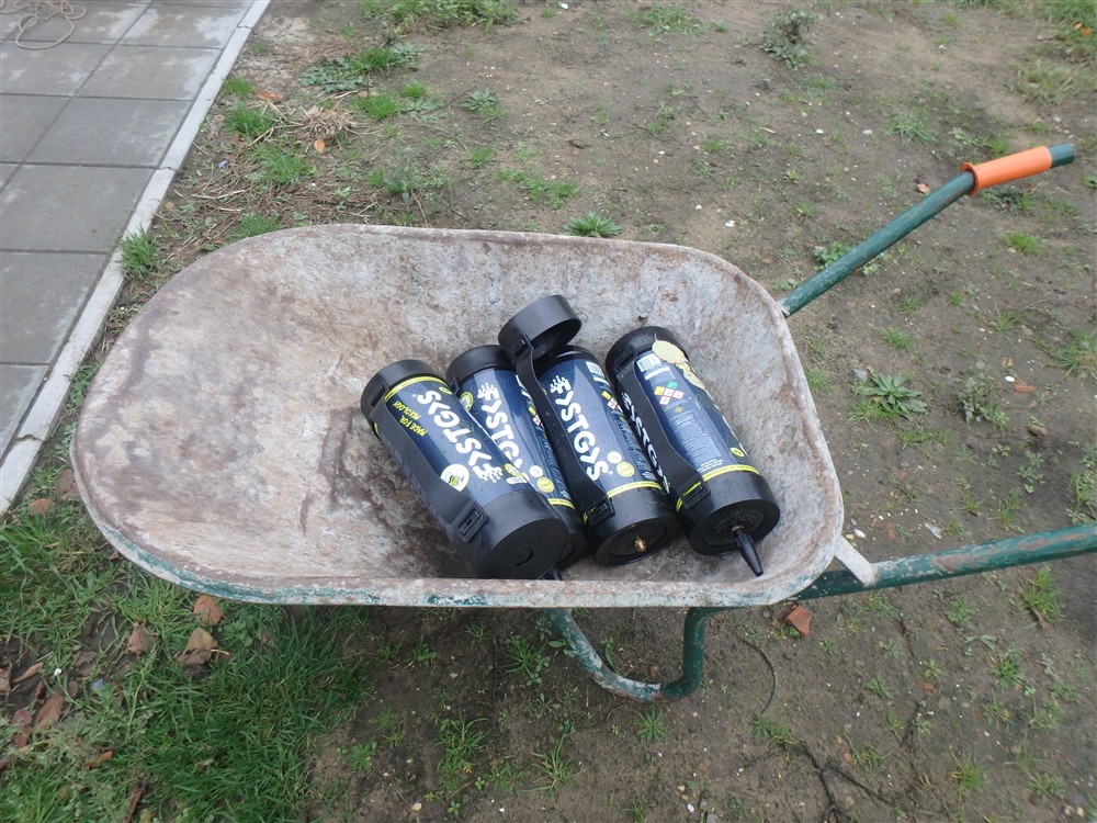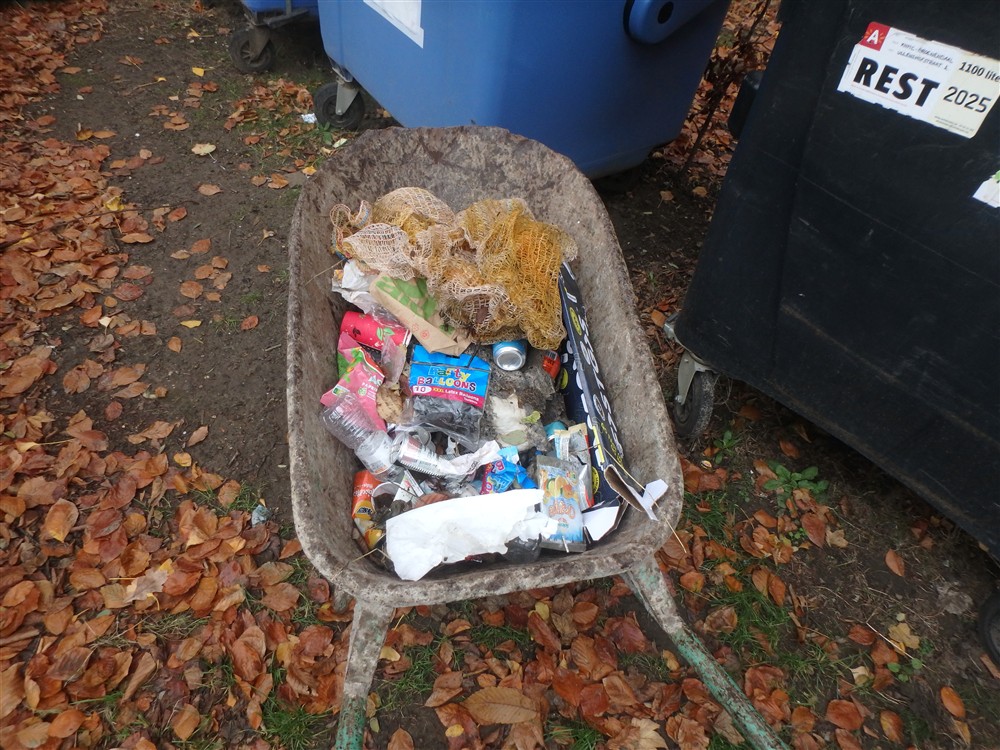 Tenslotte ruim ik het sluikstort op dat zich overal in de struiken op de parking bevindt. Twee volle kruiwagens haal ik bijeen met weer opvallend veel zwarte ballonnen (van de lachgassnuivers...) en drankblikjes.