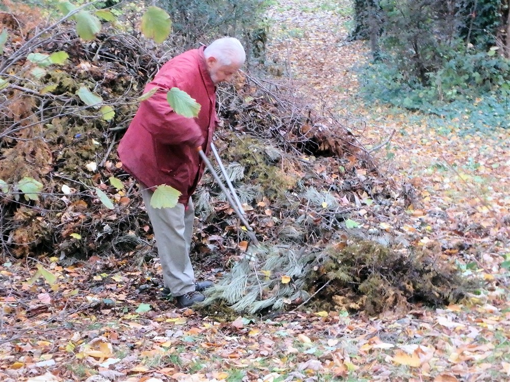 Peter en ikzelf trachtten zoveel mogelijk takken van de omgewaaide beuk (zie vorige week) te verwerken. Dat betekent zagen, met de snoeischaar dunnere takken afknippen en tenslotte al deze dode takken vervoeren naar een plaats waar ze later verwerkt zullen worden. Na afloop van ons werkuurtje ziet deze plaats er al heel anders uit dan vorige week!