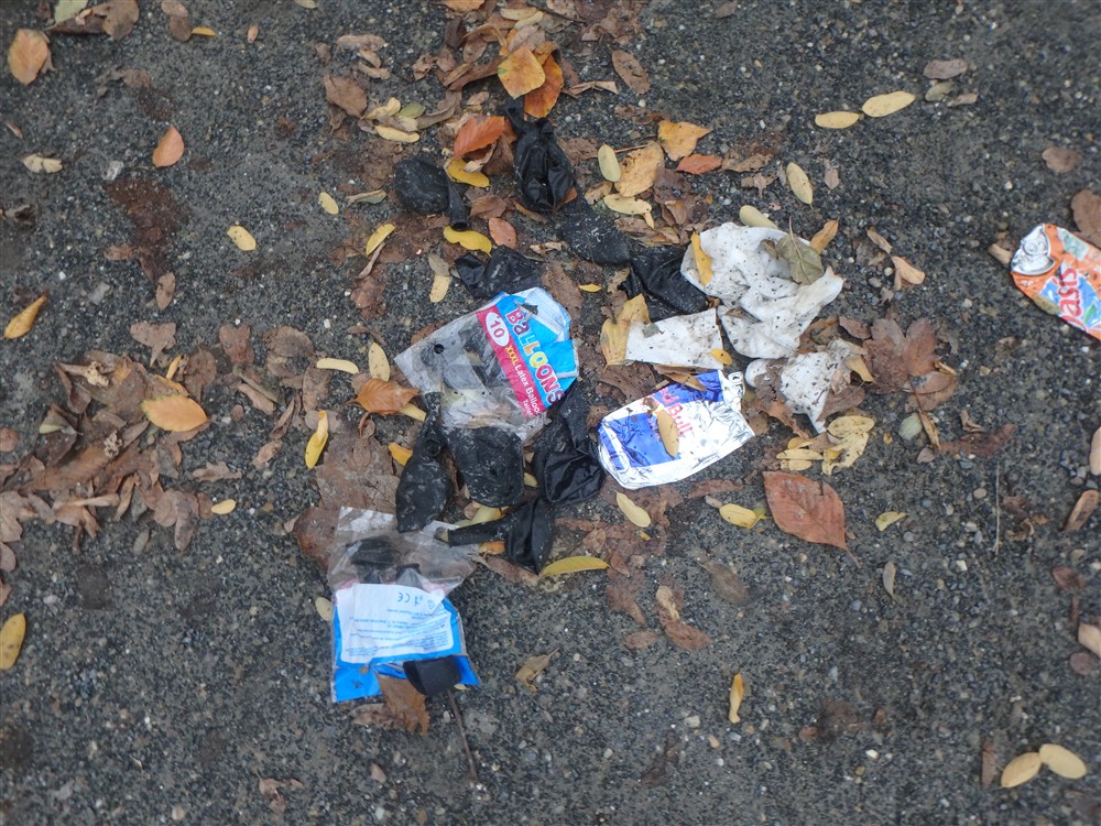 De parking voor de sporthal blijft de lachgasgebruikers aantrekken. Opnieuw vonden wij vier flessen lachgas en heel wat zwarte ballonnen die gebruikt worden om dat gas te inhaleren. Dat bleek eens temeer bij het schoon maken van de parking.