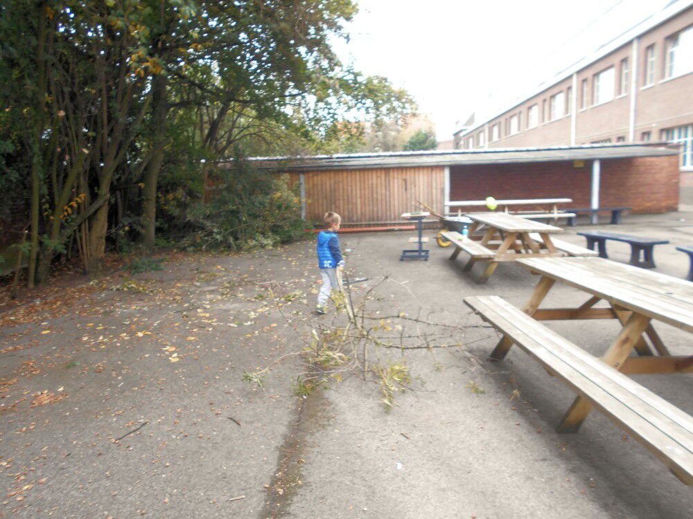 Op de speelplaats kluizevelden werden de overhangende takken (die soms tot meer dan vijf meter over de speelplaats hingen) afgezaagd of gesnoeid. Dat geeft weer wat ruimte maar het laat ook een twee meter hoge berg takken achter die in één van de volgende weken moeten verhakseld worden.