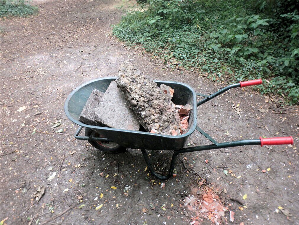Een plek waar wij nog veel houtafval en steenpuin vinden, is de omgeving van het scoutslokaal.