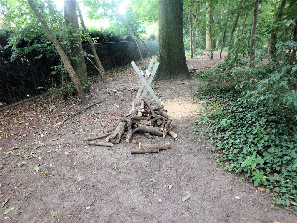 Tijdens het voorjaar werden heel wat dode takken gesnoeid (alle mogelijke formaten). Die liggen in deze hoek van het park verspreid. De dikkere stukken worden verzaagd tot brandhout, de dunnere stukken worden gestapeld om later verhakseld te worden.