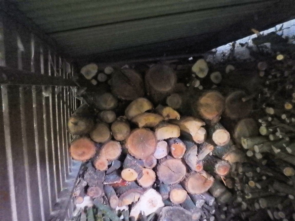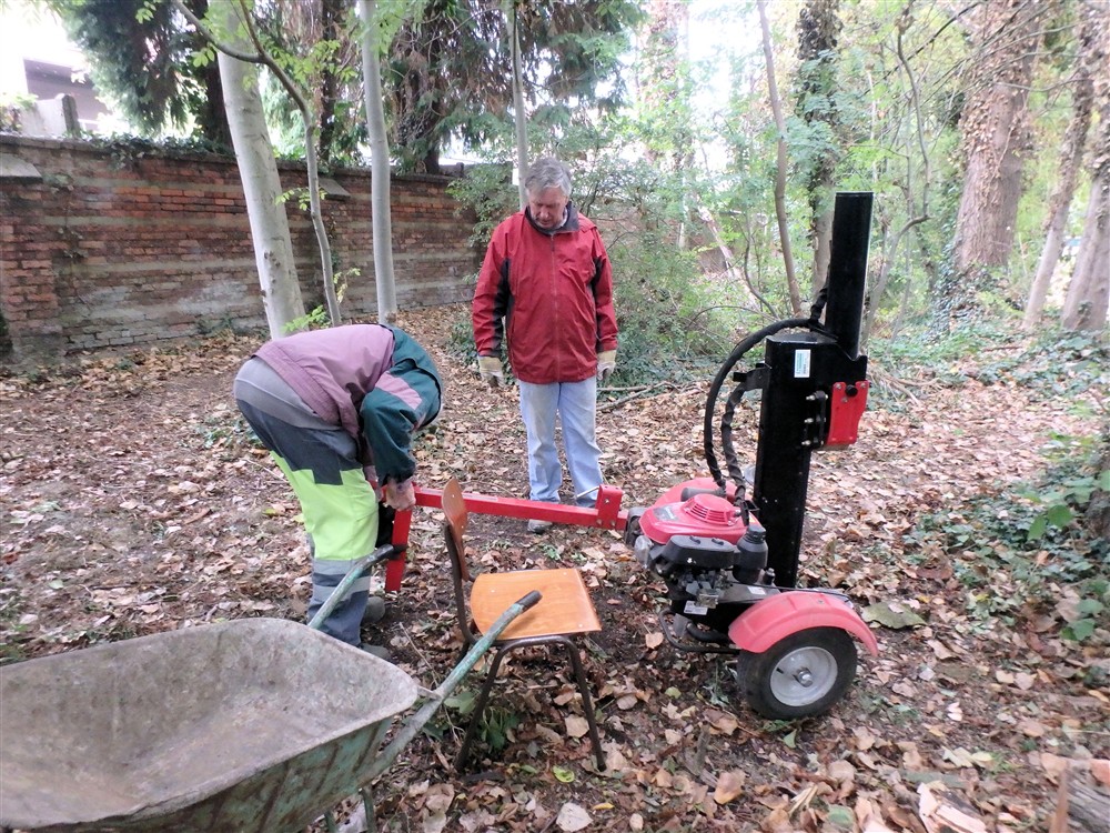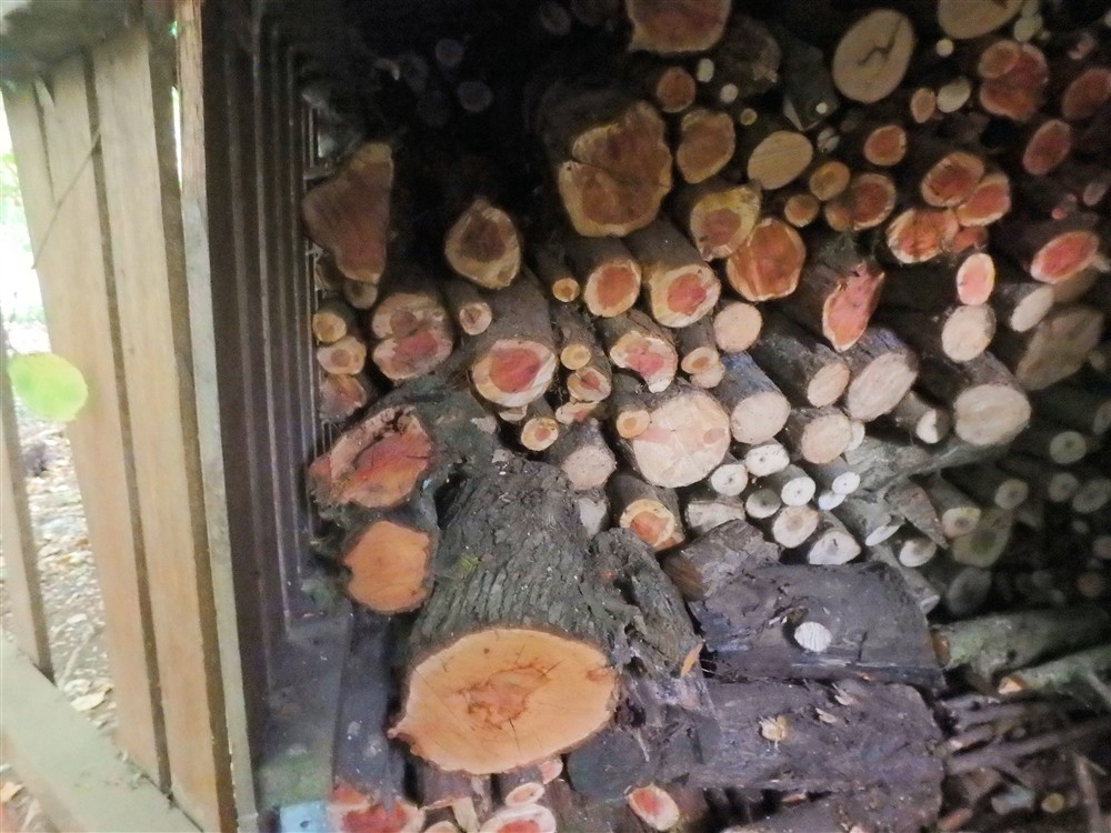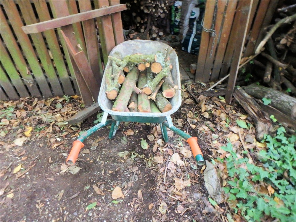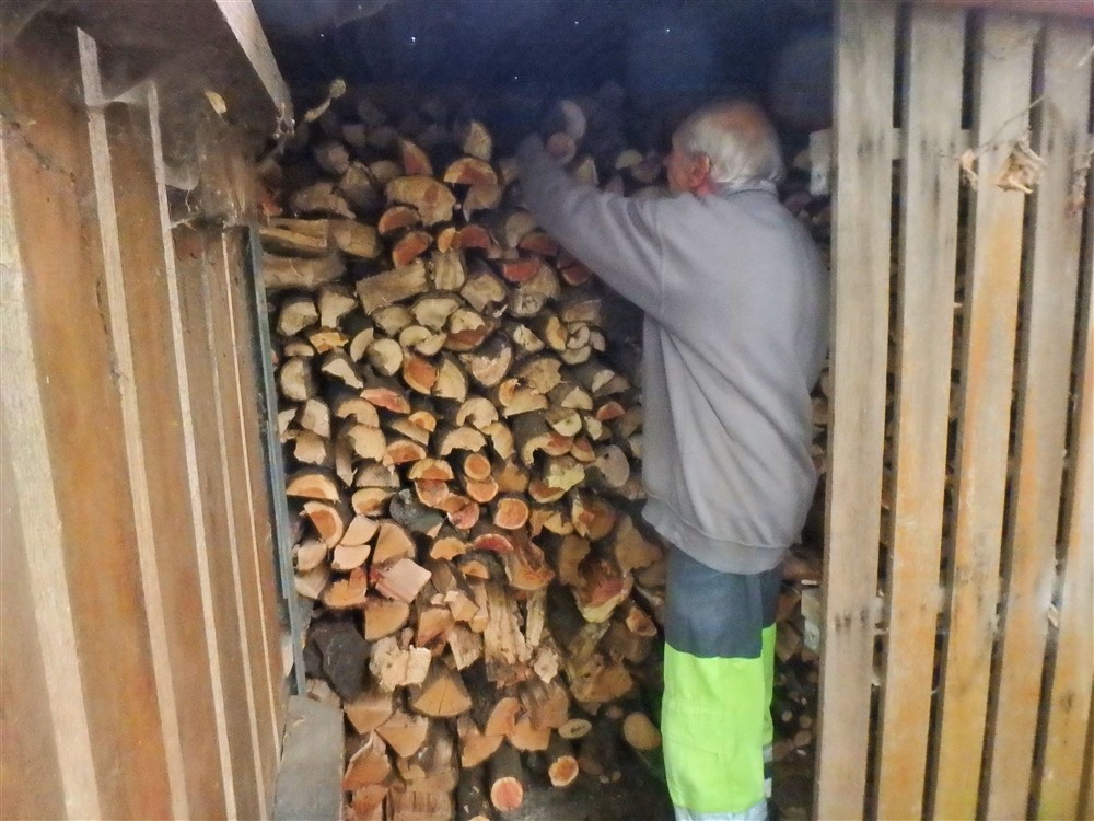 Dat nam de hele namiddag in beslag en dus niet veel foto's. Eerst zie je Dirk en François die de kliever gereed maken, dan een kruiwagen met hout, vervolgens twee delen van de bergplaats met het te klieven hout en tenslotte de bergplaats waarin het gebruiksklare hout wordt gestapeld. Meer moet dat niet zijn...
