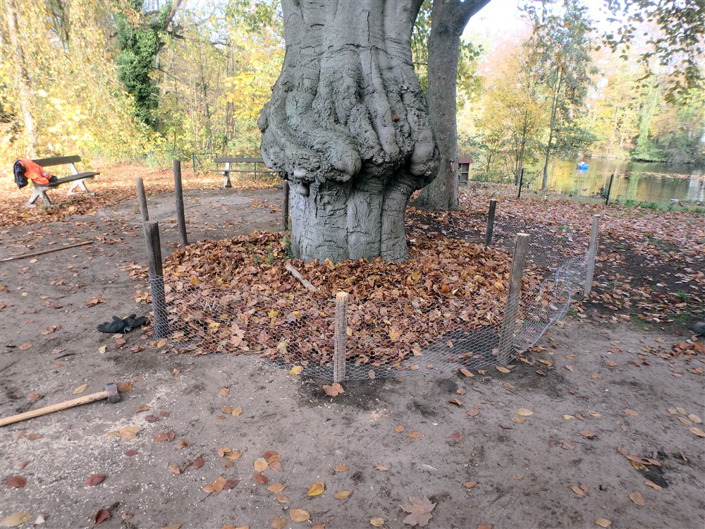 De rest van de parkploeg trok naar de achterzijde van het kasteel. Daar werden een achttal palen in de grond geboord met de bedoeling een omheining rond de oude beuk te maken zodat de wortels kunnen beschermd en gevoed worden. Met de nodige middelen en mankracht is dit werkje tot een goed einde gebracht.