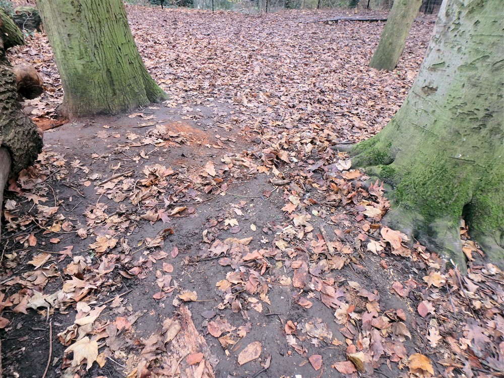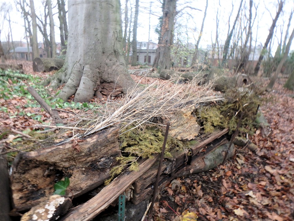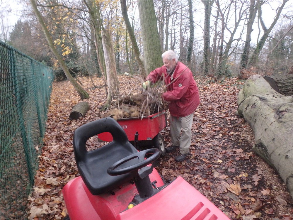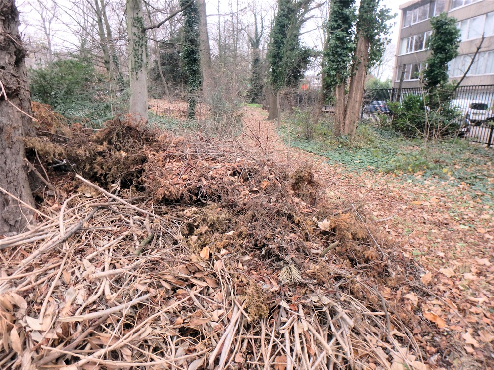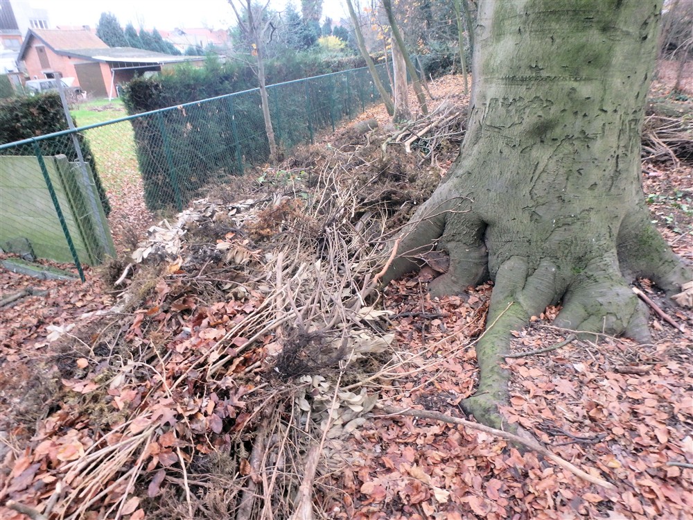 Aan die achterkant van het park liggen ook veel afgebroken takken, verspreid over de bodem. Die gaan wij allemaal oprapen en mee rond de boom stapelen.