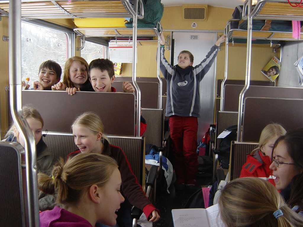 Onze treinreis naar de ZwitserseAlpen duurde lang en was voornamelijk vermoeiend.Het sleuren met de valiezen van her naar der was niet bepaald een leuk karweitje.Gelukkig kregen we nog hulp tot in Brussel.Iedereen heeft dit schitterend gedaan.Hoe kan het ook anders met de titel die ze ons vroeger hebben gegeven : De Belgen, de dappersten van allen.In dit geval kunnen we wel met zekerheid stellen dat de Huizingenaren daar zeker toe behoren.De bewijzen zijn geleverd.Van de Belgen wordt wel eens gezegd dat het een heel klein land is, maar daar waren de zesdeklassers nu eens niet mee akkoord.Ze konden het maar moeilijk geloven dat het ettelijke uren sporen was om België te verlaten. "Neen, zo klein zijn we nu ook weer niet ! riepen ze allen in koor. Van de slaapplaatsen in de treinzullen we maar niet al te veel vertellen.We hebben ons best gedaan om zoveel mogelijk te kunnen slapen.Als dat een geruststelling is.