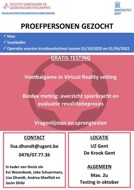Ik ben een 2e Master studente Revalidatiewetenschappen en Kinesitherapie aan de Universiteit Gent. Samen met 2 medestudenten ben ik op zoek naar proefpersonen die willen deelnemen aan het onderzoek van onze Masterproef. Op de affiche vind je de criteria: