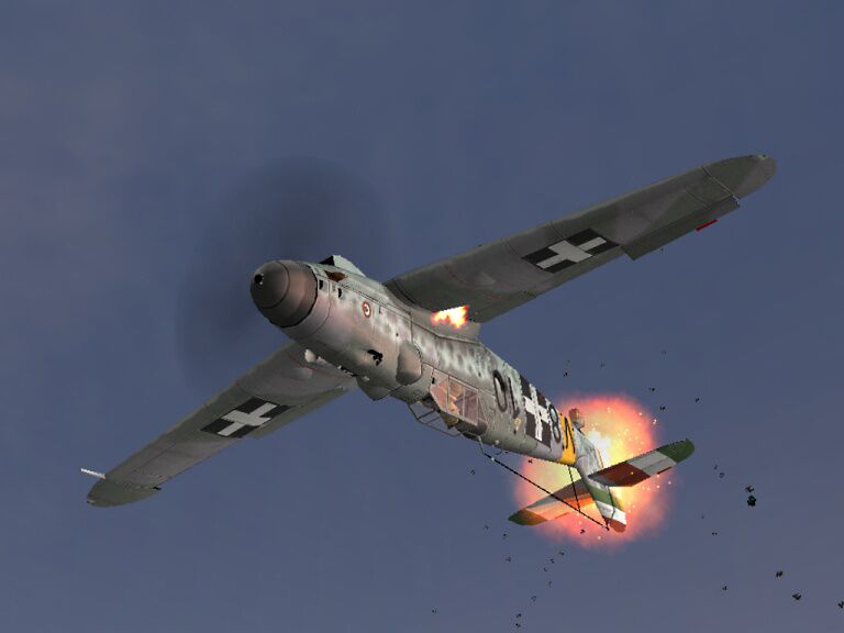 Hongaarse jachtbommenwerper // Duits jachtvliegtuig // Russisch jachtvliegtuig. Opnieuw stijgen we hier op met 4 van onze Fw-190 jabo's beladen met bommen,om een bomaanval uit te voeren op bevoorradings collonne's van de Russen net achter het front.Als escorte vliegen ditmaal opnieuw 4 Duitse Bf-109 jachtvliegtuigen mee voor de nodige luchtdekking.Eenmaal ons doel in zicht zetten we de bomaanval in en droppen onze bommen op voertuigen die zich blijkbaar schuil houden aan de rand van een bos.Na onze bomaanval merken we een Russische patroulje op,bestaande uit 4 Russische Yak-3 jachtvliegtuigen.Waarop een luchtgevecht onstaat,en de Russen uiteindelijk 1 van onze Fw-190 jabo's en 2 Duitse Bf-109 jagers weten neer te halen.Maar na een tijd weten we alle Yak-3 jagers neer te halen,waarvan ik zelf er 2 weet uit de lucht te halen.Na deze missie is hiermee mijn score voor neergehaalde vijandelijke vliegtuigen gestegen tot 7 stuks.