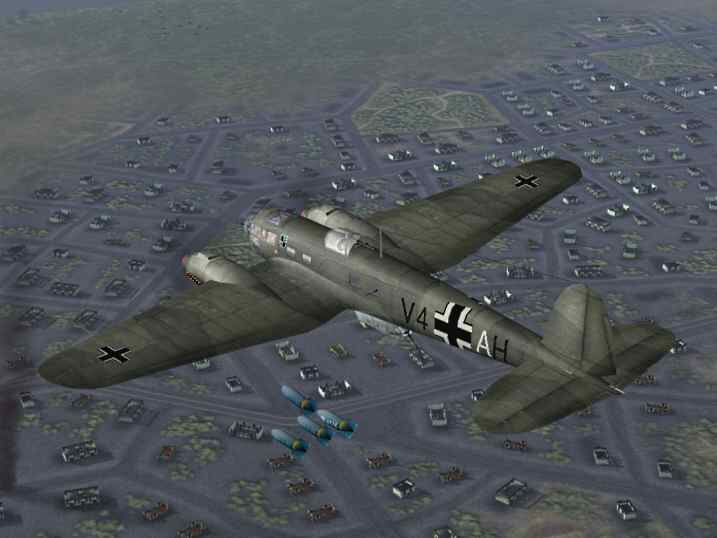 Duitse bommenwerper // Duitse jachtbommenwerper. Intussen zijn onze grondtroepen Stallingrad binnen getrokken,waar nu heftig gevochten word.Zelf stijgen we op met 3 Bf-110 jabo's,beladen met bommen.Hoofddoel is een spoorbrug net achter Leninsk bombarderen,om zo de aanvoer van matriaal per spoor een halt toe te brengen.Tegelijker tijd stijgen er 4 He-111 bommenwerpers op,vanaf een ander vliegveld.Zij gaan op grote hoogte over Stallingrad,waarbij alle bommenwerpers worden getroffen door het Russische AA geschut.En hierdoor vroegtijdig hun bommen moeten lossen.Waarop deze formatie terugkeerd zonder het doel bereikt te hebben.Zelf hebben we met succes op lage hoogte Stallingrad overvlogen,waarna we na een tijd ons doel bereiken.Hierbij merken we op dat er net een goederentrein over de brug is gereden,waarop we al onze bommen droppen op deze trein.Waarna we allen keren en opnieuw aanvallen met de boordwapens.Hierbij weet ik 1 gronddoel te vernietigen,waarna we terugkeren naar onze thuisbasis.Hiermee is ook mijn eerste score voor vernietigde gronddoelen binnen.