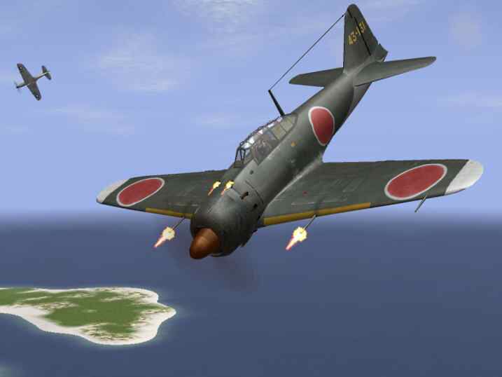 Japans jachtvliegtuig // Amerikaans jachtvliegtuig // Amerikaanse torpedobommenwerper // Amerikaanse bommenwerper. Onze verkennings vliegtuigen hebben een Japanse vloot ontdekt die de eilanden hier naderen.Waarop we orders krijgen,om een aanval uit te voeren op deze Japanse schepen.Hiervoor zijn we in de lucht met 12 Dauntless bommenwerpers,en 6 Avenger torpedobommenwerpers.Als escorte vliegen boven onze formatie's nog eens 4 Hellcat jachtvliegtuigen.Als we eenmaal de Japanse vloot naderen,worden we plots aangevallen door 4 Japanse Zero jachtvliegtuigen.Waarbij onze Hellcat's in actie komen,en deze Japanners na een langdurig luchtgevecht allen weten neer te halen.Intussen hebben de Avenger's als eerste formatie de aanval ingezet met torpedo's en een deel met bommen op de Japanse schepen.Gevolgd door onze Dauntless bommenwerpers die hun bommen droppen op de schepen.Hierbij word het Japanse vliegdekschip tot zinken gebracht.Aan onze zijde verliezen we 8 Dauntless en 4 Avenger bommenwerpers door het Japanse AA geschut.Zelf liep mijn eigen toestel ook schade op,maar haalde nog net ons vliegdekschip.