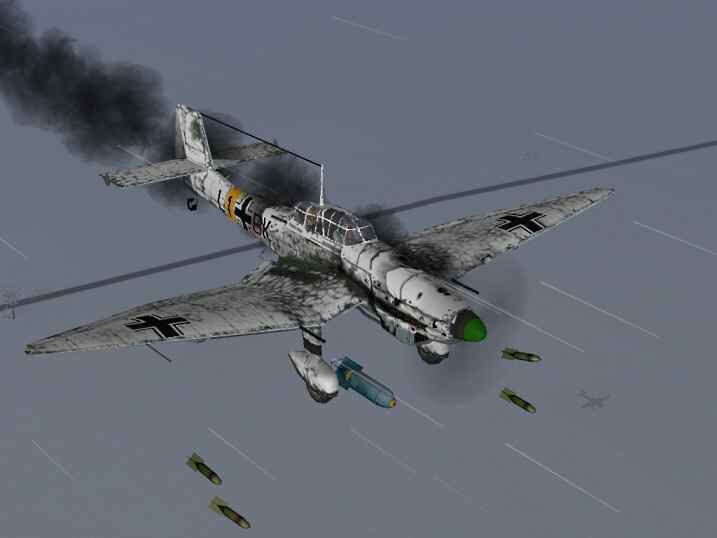 Duitse duikbommenwerper // Russisch grondaanvals vliegtuig // Russisch jachtvliegtuig. Het is intussen aan het sneeuwen als we hier opstijgen met 4 van onze Bf-110 jabo's beladen met bommen.Voorop stijgen nog eens 4 Stuka's op om aan het front ten noorden van Stallingrad voertuigen en panser eenheden te bombarderen.Eenmaal het doel in zicht word de bomaanval uitgevoerd,waarbij 1 Stuka word neergehaald door het Rusissche AA geschut.Zelf missen mijn bommen allen doel.Intussen merken we met zen allen een Rusissche formatie op van 4 Il-2's en 2 I-16 jachtvliegtuigen.Waarop we met zen allen in de aanval gaan op deze Russische vliegtuigen.Uiteindelijk weten we 2 Il-2's neer te halen,waarna de overgebleven Il-2's hun bommen droppen op een Duitse tank eenheid.Daarna worden deze beide Il-2's ook neergehaald.De Russische I-16 jachtvliegtuigen weten een van onze Bf-110 jagers te beschadigen,maar uiteindelijk word er een I-16 neergehaald,en de tweede weet uiteindelijk te ontkomen.Zelf wist ik hier enkel schade toe te brengen aan een van deze I-16's.