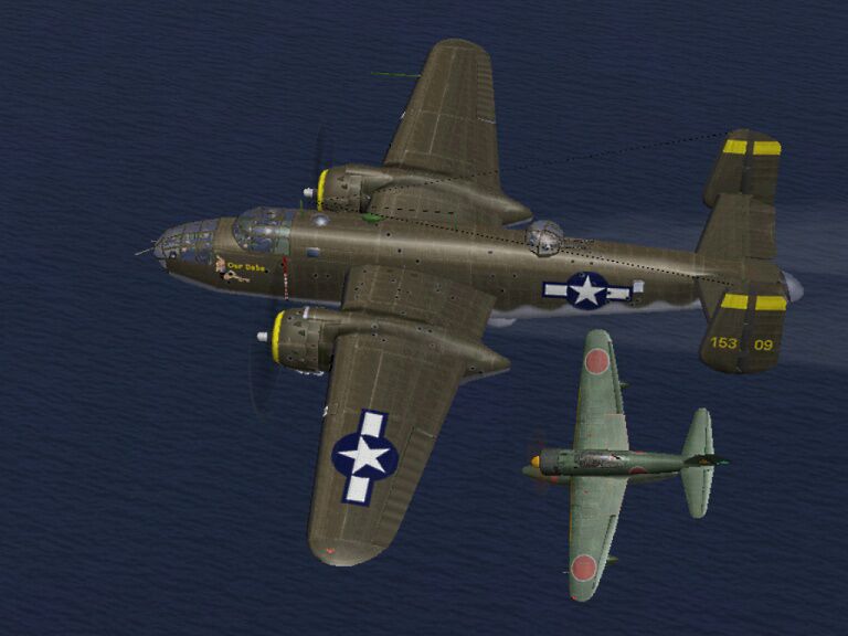 Japans jachtvliegtuig // Amerikaanse bommenwerper. 1942,Pacific.Hier zijn we gestationeerd op een eiland in de Pacific,en gebruiken de haven als thuisbasis met onze Rufe watervliegtuigen.Plots komt er een bericht binnen,dat een vijandelijke formatie richting ons eiland vliegt.Waarop we meteen opstijgen met 4 Rufe jachtvliegtuigen,om de indringers te onderscheppen.Na een tijd in de lucht te zijn,ontdekken we 6 Amerikaanse B-25 bommenwerpers,die blijkbaar richting onze haven vliegen.Meteen gaan we over tot de aanval,waarbij ik al bij de eerste aanval schade oploop,en wat later een landing moet uitvoeren net voor de haven.Intussen wisten mijn collega's de B-25 bommenwerpers neer te halen,waarvan een bommenwerper de haven wist te bereiken,maar meteen werd neergehaald door het AA geschut.Aan onze zijde verliezen we 1 Rufe,hij werd door een boordschutter neergehaald.