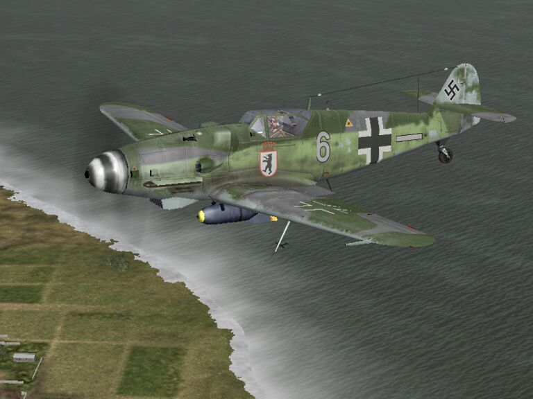 Duitse jachtbommenwerper // Amerikaans jachtvliegtuig. 1944,Nederland.Met 12 Bf-109 jabo's zijn we hier op lage hoogte boven de Noord-Zee onderweg,om een verrasings aanval uit te voeren op een geallieerd vliegveld.Zodra dit doel in zicht komt zetten al onze toestellen de bomaanval in.Hierbij weet ik 1 gronddoel te vernietigen,maar word zelf daarbij neergehaald door het AA geschut.Intussen weten ook 2 Amerikaanse Lightning jachtvliegtuigen op te stijgen,en vallen onze toestellen aan.Uiteindelijk word hierbij 1 Lightning neergehaald door een van onze jagers,en verliezen we in totaal 6 van onze Bf-109 jabo's door het AA geschut en de jachtvliegtuigen.