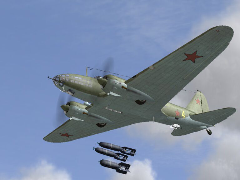 Duits jachtvliegtuig // Russische bommenwerper. 1941,Duits-Russische grens.Onze troepen zijn al een paar dagen geleden Rusland binnen getrokken.Als op ons vliegveld plots het luchtalarm afgaat,blijkbaar komen de Russen ons vliegveld bezoeken.Meteen stijgen we op met 4 klaar staande Bf-109 jachtvliegtuigen.We zijn maar net in de lucht,of de bommen vallen reeds op ons vliegveld.Deze worden door 12 Russische DB-3 bommenwerpers afgeworpen.Tijdens hun bomaanval word er al meteen 1 DB-3 neergehaald door ons AA geschut.Daarna zetten we zelf de aanval in op deze bommenwerper formatie,waarbij we uiteindelijk 5 bommenwerpers weten neer te halen.Hiervan wist ik zelf 2 DB-3's uit de lucht te halen,en verliezen we aan onze zijde 2 Bf-109 jagers,zij werden door de boordschutters neergehaald.