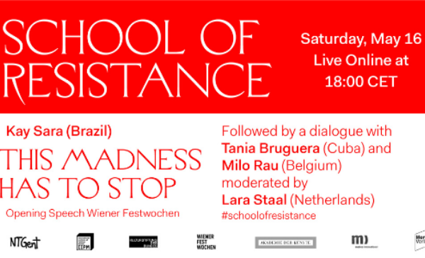 Om de problemen van vandaag op te lossen en waardevolle alternatieven te bedenken voor de toekomst, creëert de tweewekelijkse livestream School of Resistance een platform voor gesprekken met experts in verandering over de hele wereld: kunstenaars, activisten, politici en filosofen.
