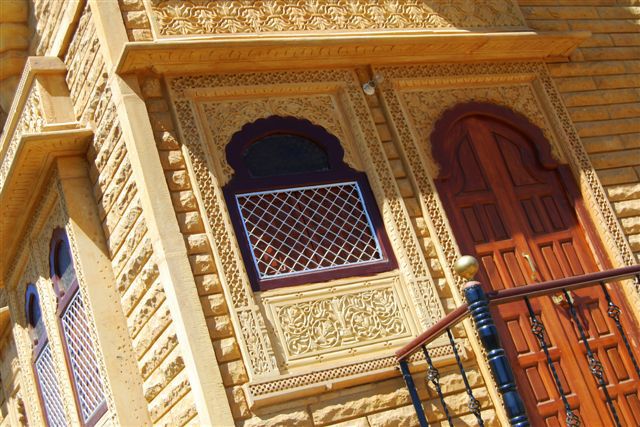 Gisteren op het dakterras van mijn sympathieke verblijfplaats, hotel Harasar Haveli, gedineerd. De gangen van het hotel zijn kunstig verfraaid met plafondschilderingen. De kamers zijn sober, maar mooi bemeubeld en proper, er is zelfs een bad