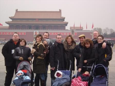 nog snel even een groepsfoto 'en petit comité' met de aanwezigen van op het Tian'an Menplein (plein van de hemelse vrede) met zicht op de toegangspoort tot de verboden stad met grote afbeelding van Mao