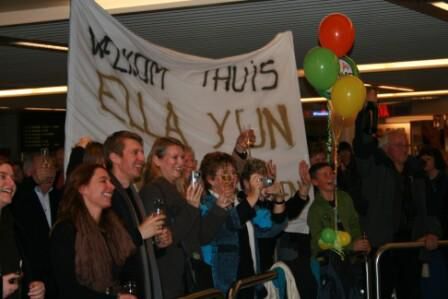 amai, wat waren we opgelucht, blij maar toch wel zeer vermoeid... en dan zo'n ontvangst ! het was gewoon super !! de fanclub Ella Yun was in grote getalen aanwezig in de aankomsthal inclusief champagne, spandoeken, triomfantelijk gejuich "JAAAAA, DAAR ZIJN ZEEE !!!!", gesigneerde foto met alle aanwezigen, allemaal ontroerde gezichten, massa's smiles en felicitaties, ... en ik kan blijven verdergaan, maar het was te overweldigend om alles op te noemen... bedankt alvast aan de aanwezigen voor de superontvangst !!!